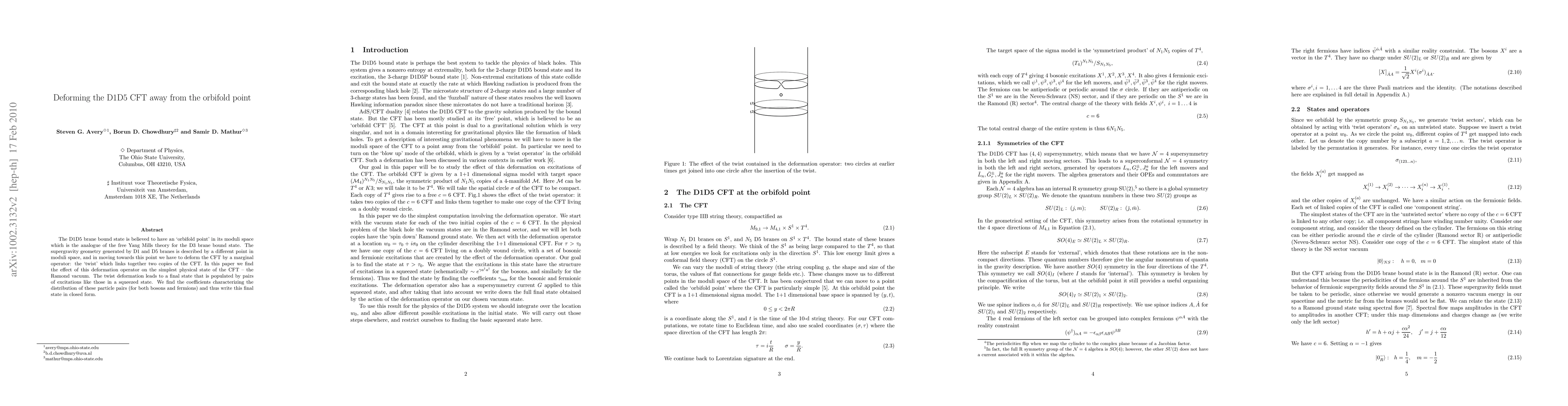 The D1D5 brane bound state is believed to have an `orbifold point' in its moduli space which is the analogue of the free Yang Mills theory for the D3 brane bound state. The supergravity geometry generated by D1 and D5 branes is described by a different point in moduli space, and in moving towards this point we have to deform the CFT by a marginal operator: the `twist' which links together two copies of the CFT. In this paper we find the effect of this deformation operator on the simplest physical state of the CFT -- the Ramond vacuum. The twist deformation leads to a final state that is populated by pairs of excitations like those in a squeezed state. We find the coefficients characterizing the distribution of these particle pairs (for both bosons and fermions) and thus write this final state in closed form.