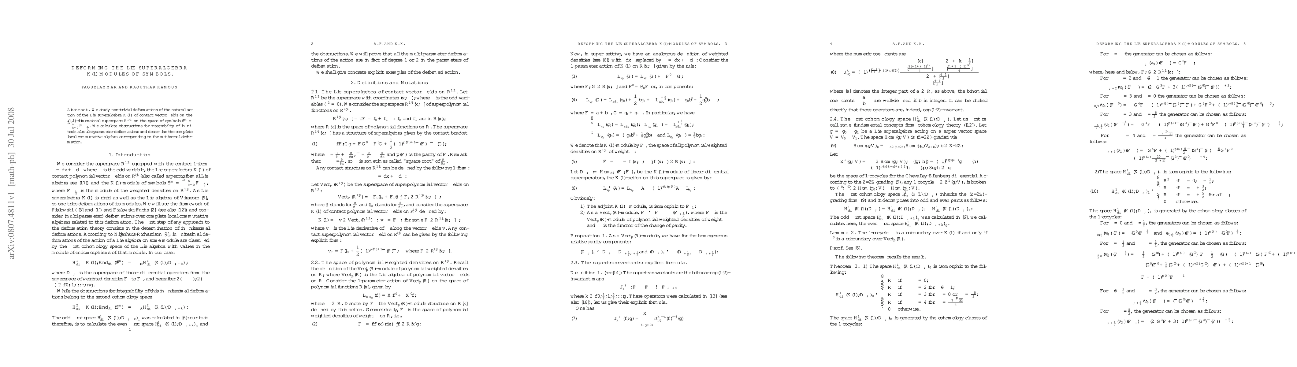 We study non-trivial deformations of the natural action of the Lie superalgebra $mathcalK(1)$ of contact vector fields on the (1,1)-dimensional superspace $mathbbR^{1|1}$ of th espace of symbols. We calculate obstructions for integrability of infinitesimal multi-parameter deformation and determine the complete commutative algebra corresponding to the miniversal deformation in the sense of A. Fialowski. Besides, we compute the first even differential cohomology space $mathrmH^1_{mathrm{diff}}(cK(1);widetilde{cD}_{lambda,mu})$ of the Lie superalgebra $mathcalK(1)$ of contact vector fields on the (1,1)-dimensional superspace $mathbbR^{1|1}$ with coefficients in the superspace $widetilde{mathcalD}_{lambda,mu}$ of linear differential operators from the superspace of weighted densities $\fF_{\lamda}$ to $\fF_{\mu}$. (To appear in Journal of Generalized Lie Theory and Applications)