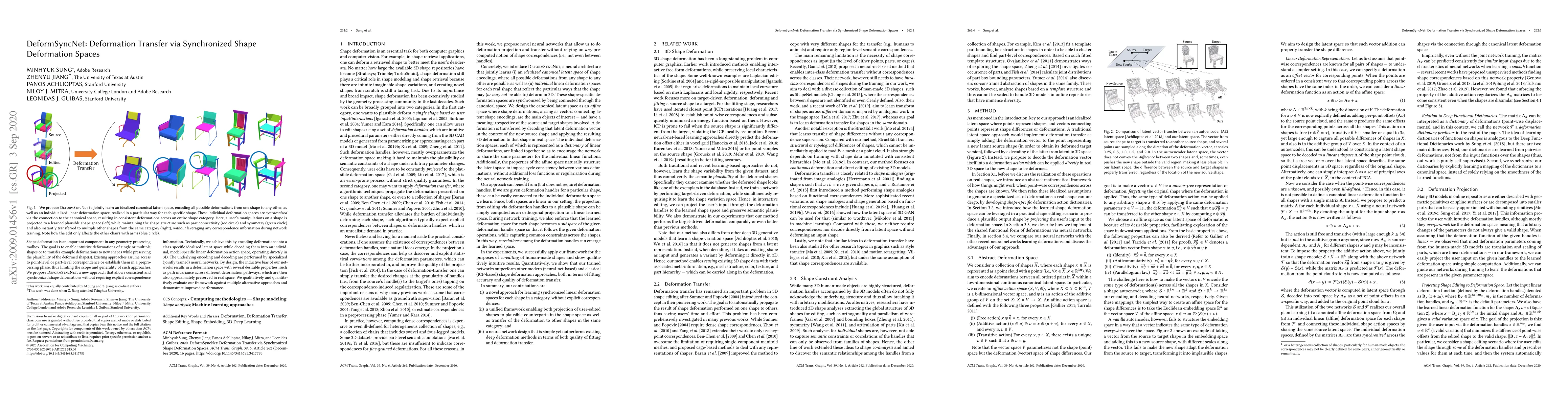 Shape deformation is an important component in any geometry processing toolbox. The goal is to enable intuitive deformations of single or multiple shapes or to transfer example deformations to new shapes while preserving the plausibility of the deformed shape(s). Existing approaches assume access to point-level or part-level correspondence or establish them in a preprocessing phase, thus limiting the scope and generality of such approaches. We propose DeformSyncNet, a new approach that allows consistent and synchronized shape deformations without requiring explicit correspondence information. Technically, we achieve this by encoding deformations into a class-specific idealized latent space while decoding them into an individual, model-specific linear deformation action space, operating directly in 3D. The underlying encoding and decoding are performed by specialized (jointly trained) neural networks. By design, the inductive bias of our networks results in a deformation space with several desirable properties, such as path invariance across different deformation pathways, which are then also approximately preserved in real space. We qualitatively and quantitatively evaluate our framework against multiple alternative approaches and demonstrate improved performance.