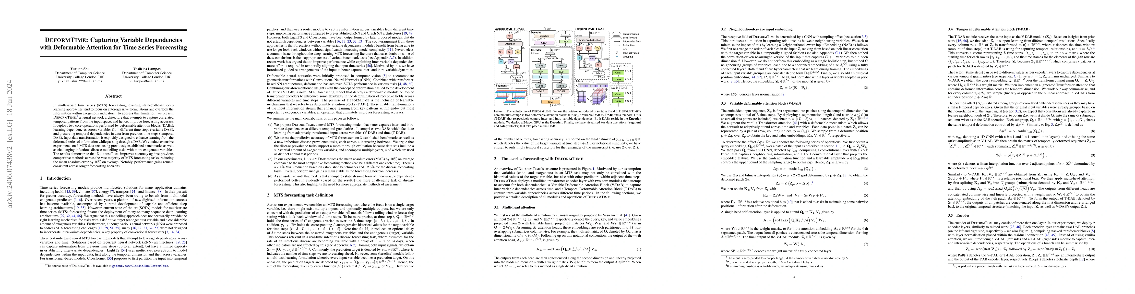 DeformTime introduces a neural network architecture using deformable attention blocks to capture variable and temporal dependencies in multivariate time series data, significantly improving forecasting accuracy and reducing mean absolute error by 10% on average across various datasets.