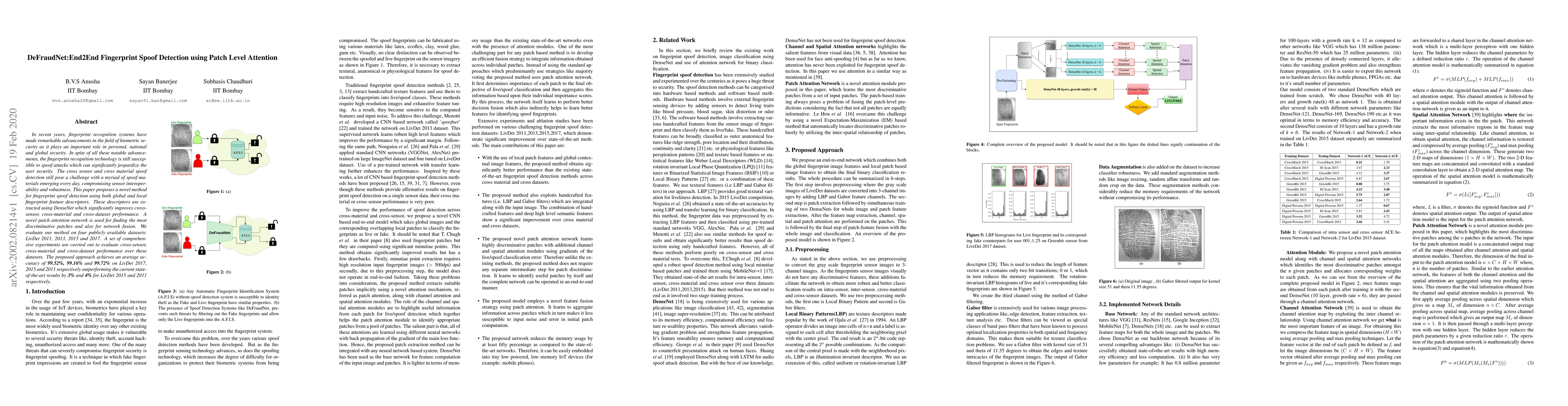 This paper proposes DeFraudNet, a novel end-to-end method for fingerprint spoof detection using DenseNet for feature extraction and a patch attention network for discriminative patch identification, achieving superior cross-sensor, cross-material, and cross-dataset performance with an average accuracy of 99.52%.