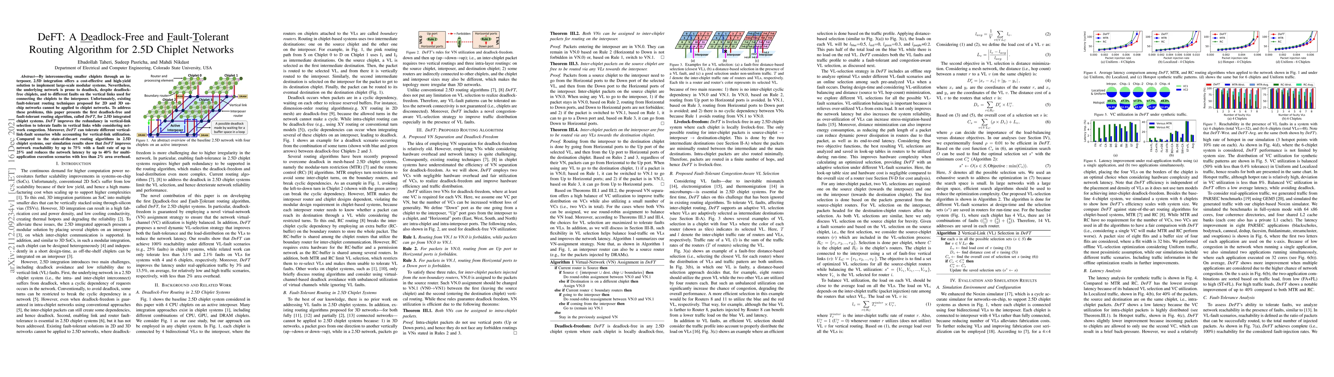 The paper introduces DeFT, a novel deadlock-free and fault-tolerant routing algorithm for 2.5D chiplet networks, addressing issues like deadlock and vertical link faults, achieving up to 75% higher network reachability and up to 40% lower latency compared to existing algorithms, with minimal area overhead.