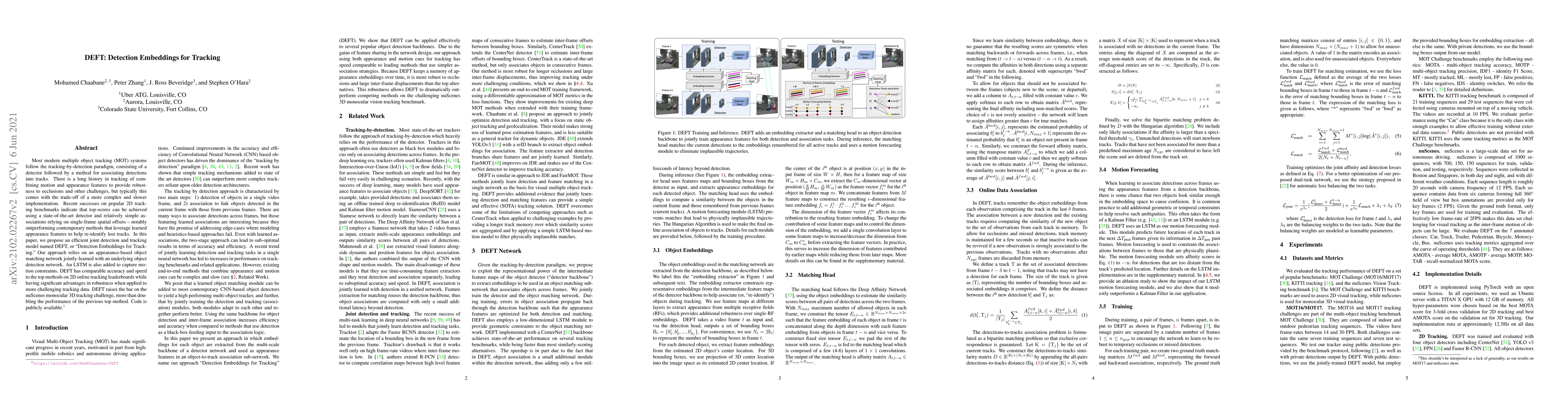 DEFT, or "Detection Embeddings for Tracking," combines an efficient detection and tracking model using an appearance-based matching network and an LSTM for motion constraints, achieving high accuracy and speed while significantly improving robustness on challenging tracking data. DEFT outperforms previous methods on the nuScenes monocular 3D tracking challenge.
