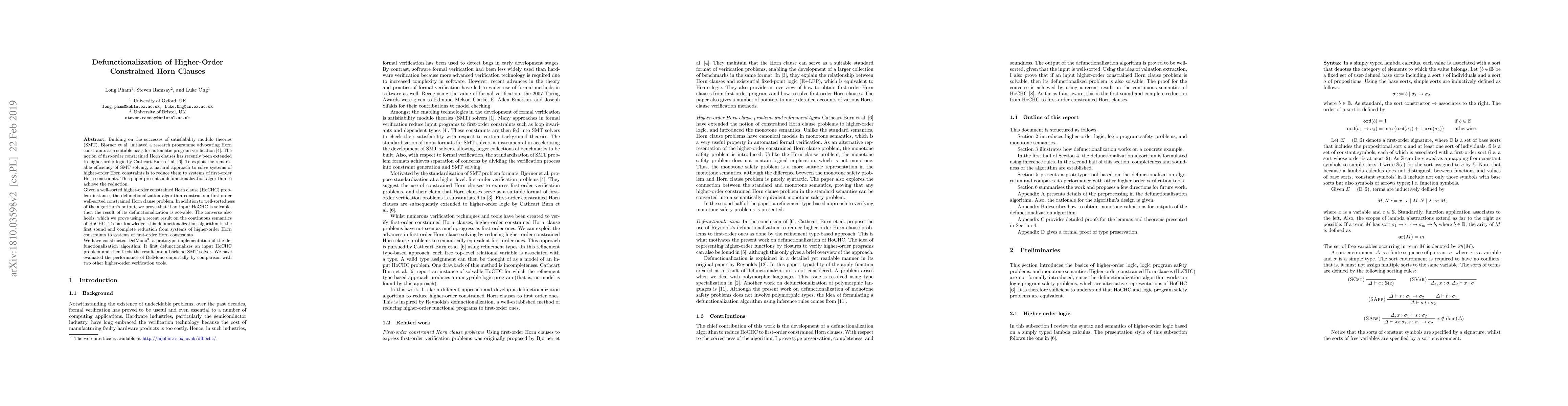 This paper introduces a defunctionalization algorithm that reduces higher-order constrained Horn clauses (HoCHC) to first-order constrained Horn clauses, preserving solvability. It presents DefMono, an implementation that leverages SMT solvers for efficient verification, and evaluates its performance against other higher-order verification tools.