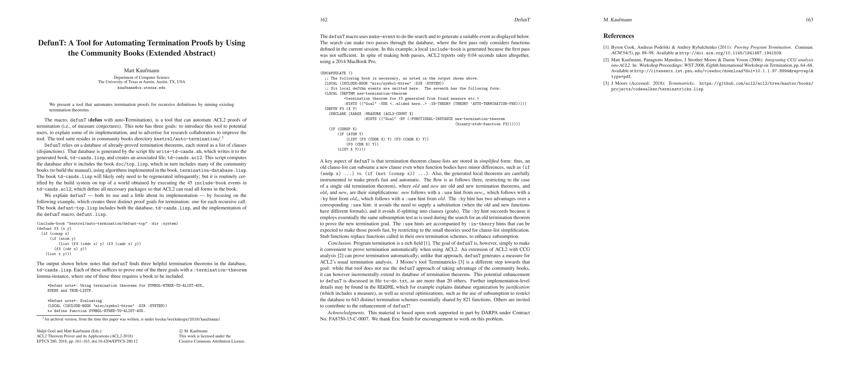 Summary: DefunT automates termination proofs for recursive definitions by leveraging existing termination theorems from community books, enhancing the efficiency of formal verification processes.