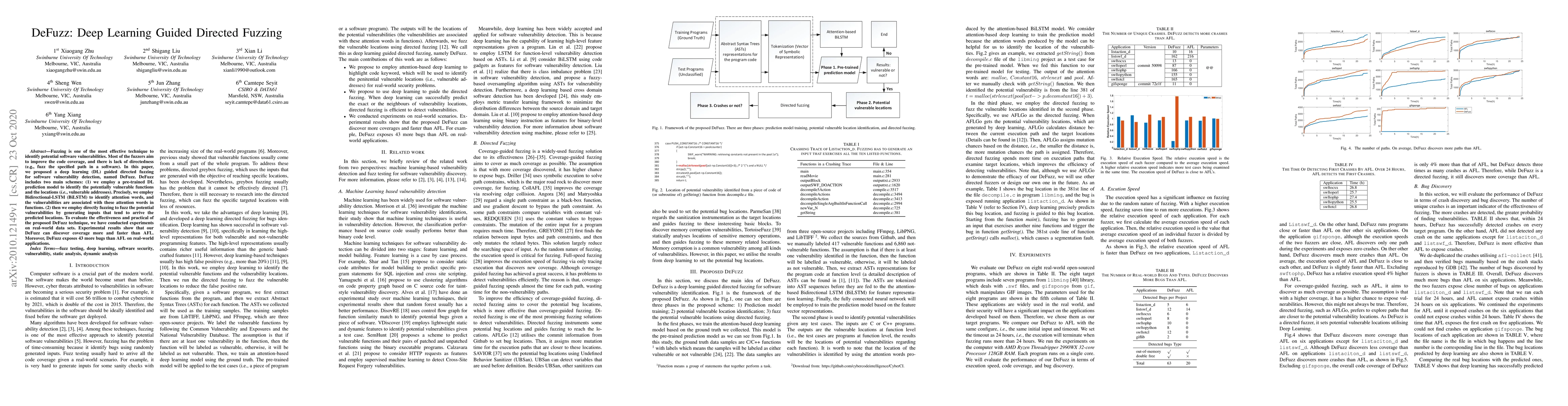 DeFuzz employs deep learning to guide directed fuzzing for software vulnerability detection, enhancing both coverage and efficiency. Experiments show DeFuzz discovers more vulnerabilities and achieves faster coverage compared to AFL.