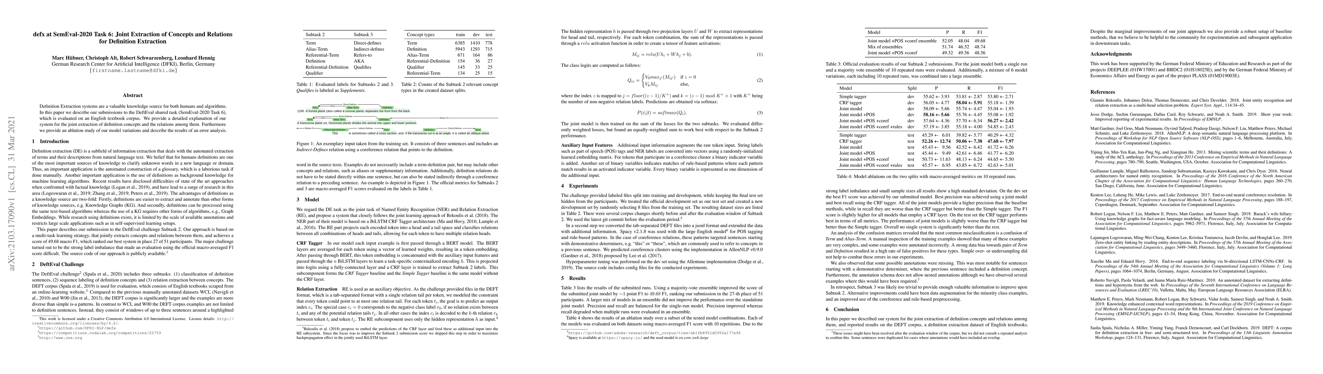 Definition Extraction systems are a valuable knowledge source for both humans and algorithms. In this paper we describe our submissions to the DeftEval shared task (SemEval-2020 Task 6), which is evaluated on an English textbook corpus. We provide a detailed explanation of our system for the joint extraction of definition concepts and the relations among them. Furthermore we provide an ablation study of our model variations and describe the results of an error analysis.