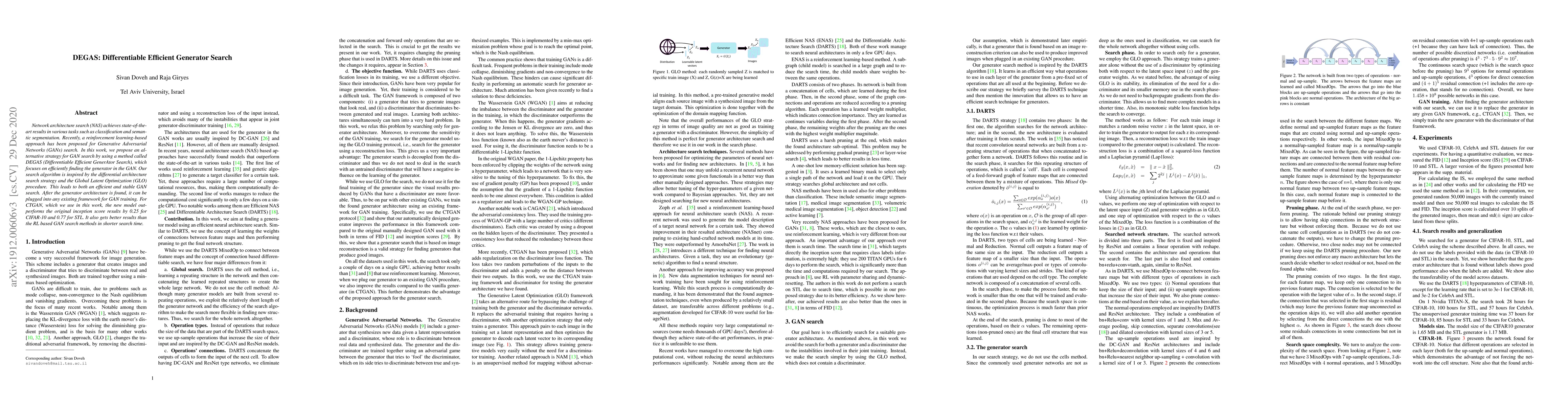 DEGAS proposes a differentiable and efficient method for searching optimal generator architectures in Generative Adversarial Networks (GANs), outperforming existing reinforcement learning-based approaches in both performance and search time.