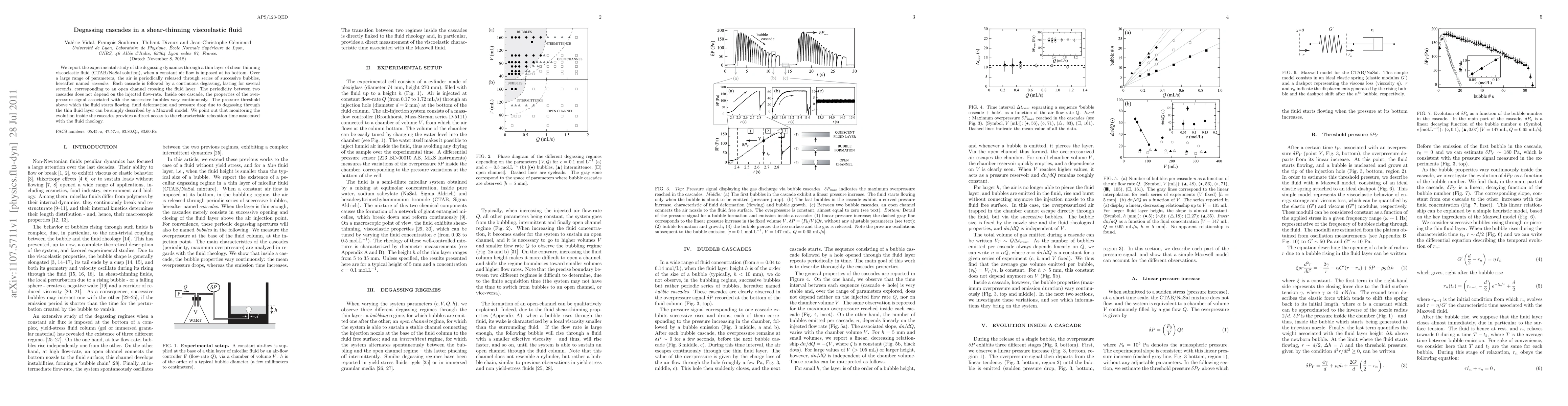 This paper investigates the degassing dynamics in a shear-thinning viscoelastic fluid under constant air flow, revealing periodic air release cascades. The study shows that the periodicity of these cascades is independent of the flow rate and provides insights into the fluid's relaxation time through the pressure threshold and degassing behavior.