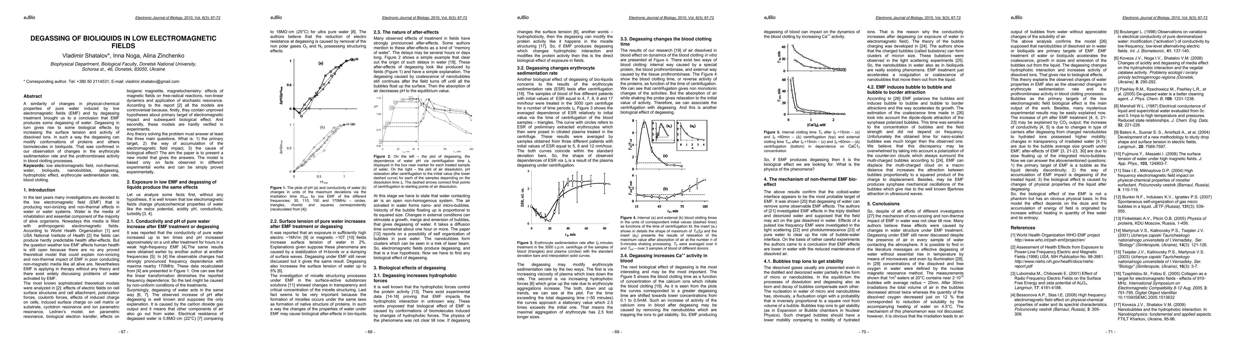 The research indicates that low electromagnetic fields (EMF) cause water degassing similar to direct degassing treatments, affecting surface tension, ion activity, and biomolecule conformations. This was demonstrated by changes in erythrocyte sedimentation rate and prothrombinase activity in blood clotting processes.