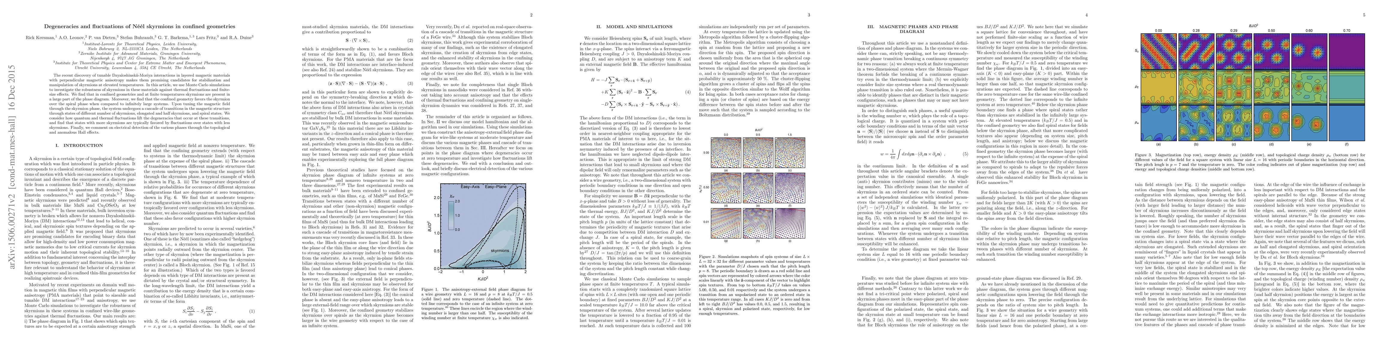 This paper investigates the stability and transitions of Néel skyrmions in confined magnetic materials using Monte Carlo simulations. It finds that skyrmions are robust in confined geometries and favor the skyrmion phase over spirals, with fluctuations favoring states with more skyrmions. The study also discusses the electrical detection of these phases via topological and anomalous Hall effects.