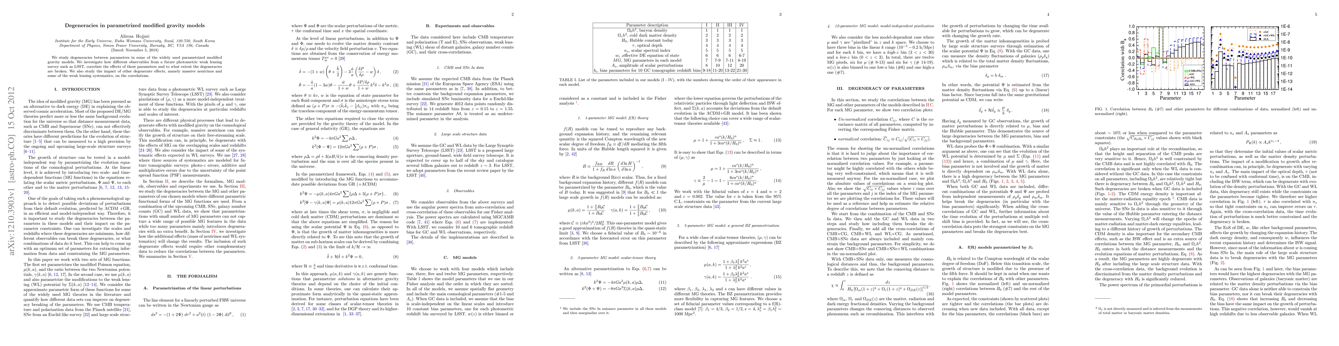 This paper examines degeneracies among parameters in popular parametrized modified gravity models, analyzing how various observables from future surveys like LSST can disentangle these effects. It also considers the influence of massive neutrinos and weak lensing systematics on these correlations.
