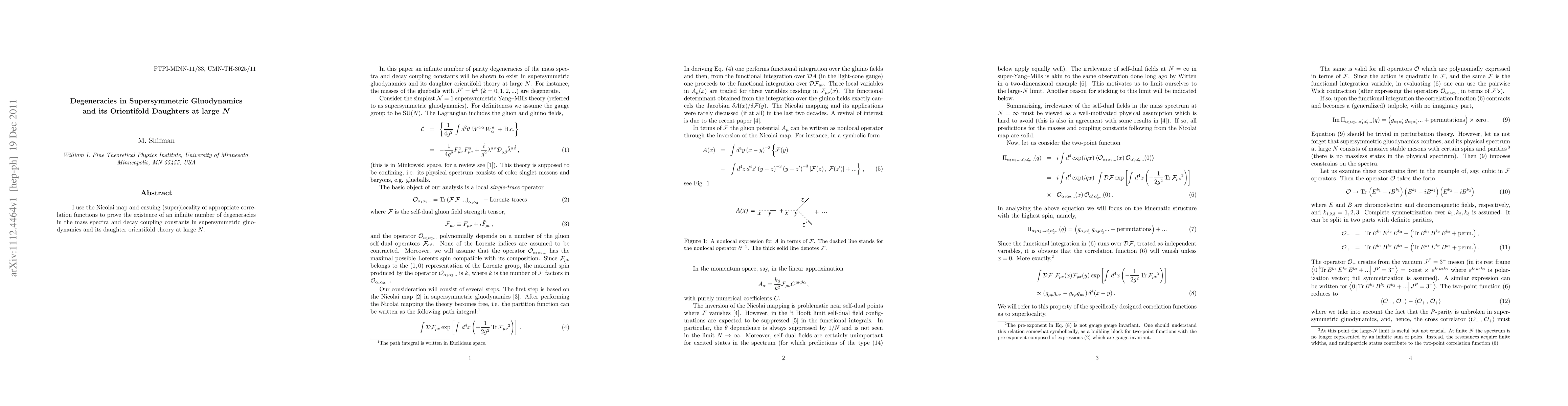 I use the Nicolai map and ensuing (super)locality of appropriate correlation functions to prove the existence of an infinite number of degeneracies in the mass spectra and decay coupling constants in supersymmetric gluodynamics and its daughter orientifold theory at large N.