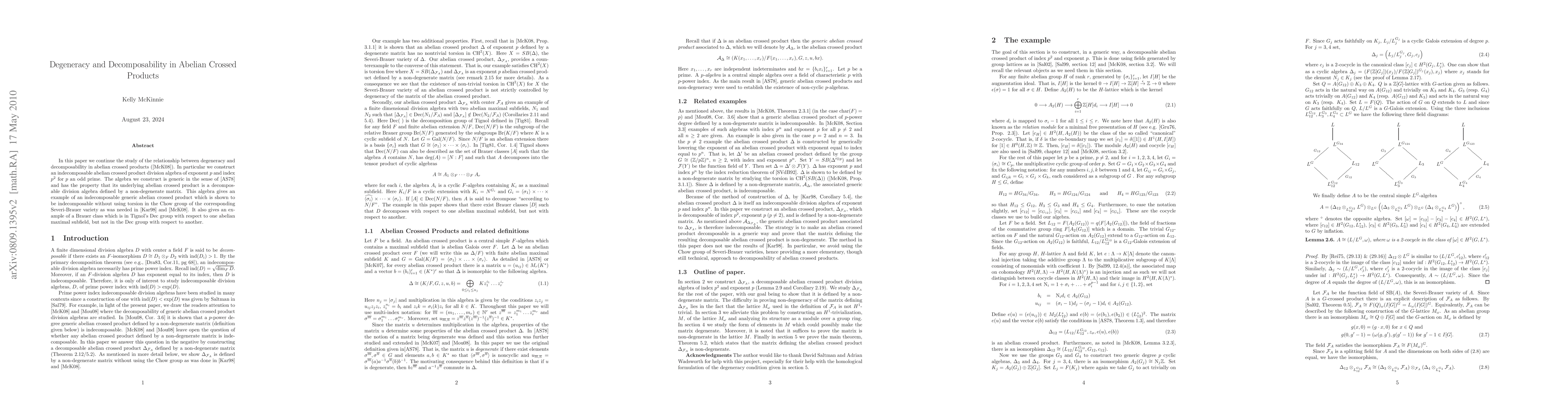 In this paper we study the relationship between degeneracy and decomposability in abelian crossed products. In particular we construct an indecomposable abelian crossed product division algebra of exponent $p$ and index $p^2$ for $p$ an odd prime. The algebra we construct is generic in the sense of Amitsur and Saltman and has the property that its underlying abelian crossed product is a decomposable division algebra defined by a non-degenerate matrix. This algebra gives an example of an indecomposable generic abelian crossed product which is shown to be indecomposable without using torsion in the Chow group of the corresponding Severi-Brauer variety as was needed in [Karpenko, Codimension 2 cycles on Severi-Brauer varieites (1998)] and [McKinnie, Indecomposable $p$-algebras and Galois subfields in generic abelian crossed products (2008)]. It also gives an example of a Brauer class which is in Tignol's Dec group with respect to one abelian maximal subfield, but not in the Dec group with respect to another.