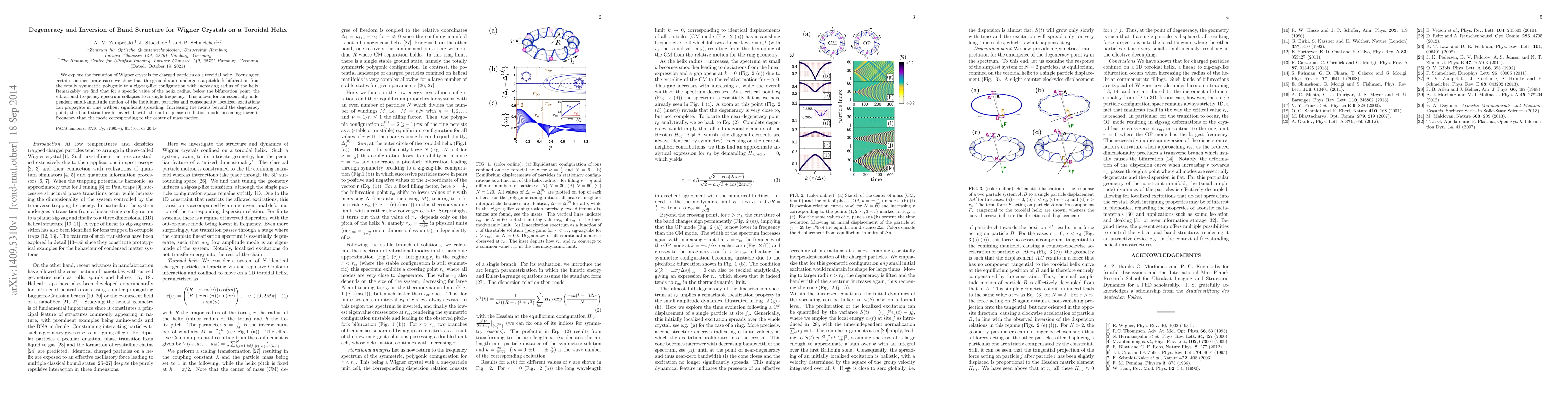 We explore the formation of Wigner crystals for charged particles on a toroidal helix. Focusing on certain commensurate cases we show that the ground state undergoes a pitchfork bifurcation from the totally symmetric polygonic to a zig-zag-like configuration with increasing radius of the helix. Remarkably, we find that for a specific value of the helix radius, below the bifurcation point, the vibrational frequency spectrum collapses to a single frequency. This allows for an essentially independent small-amplitude motion of the individual particles and consequently localized excitations can propagate in time without significant spreading. Increasing the radius beyond the degeneracy point, the band structure is inverted, with the out-of-phase oscillation mode becoming lower in frequency than the mode corresponding to the center of mass motion.