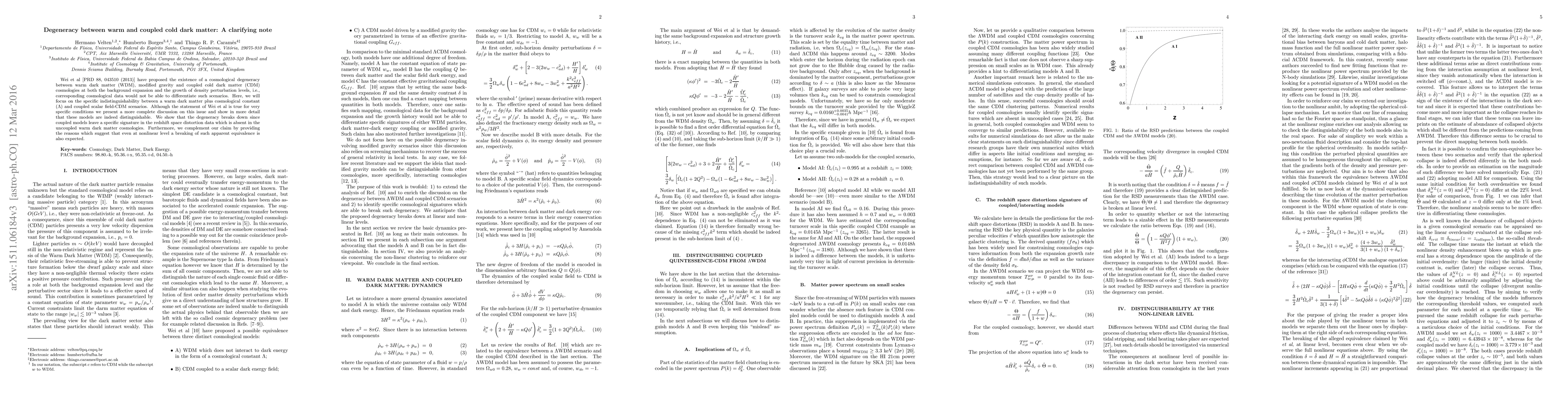 This paper clarifies the degeneracy between warm dark matter (WDM) and coupled cold dark matter (CDM) cosmologies, showing that while Wei et al. suggested indistinguishability, coupled models leave a unique signature in redshift space distortion data, breaking the apparent equivalence. The authors argue that even at nonlinear levels, these models can be distinguishable.