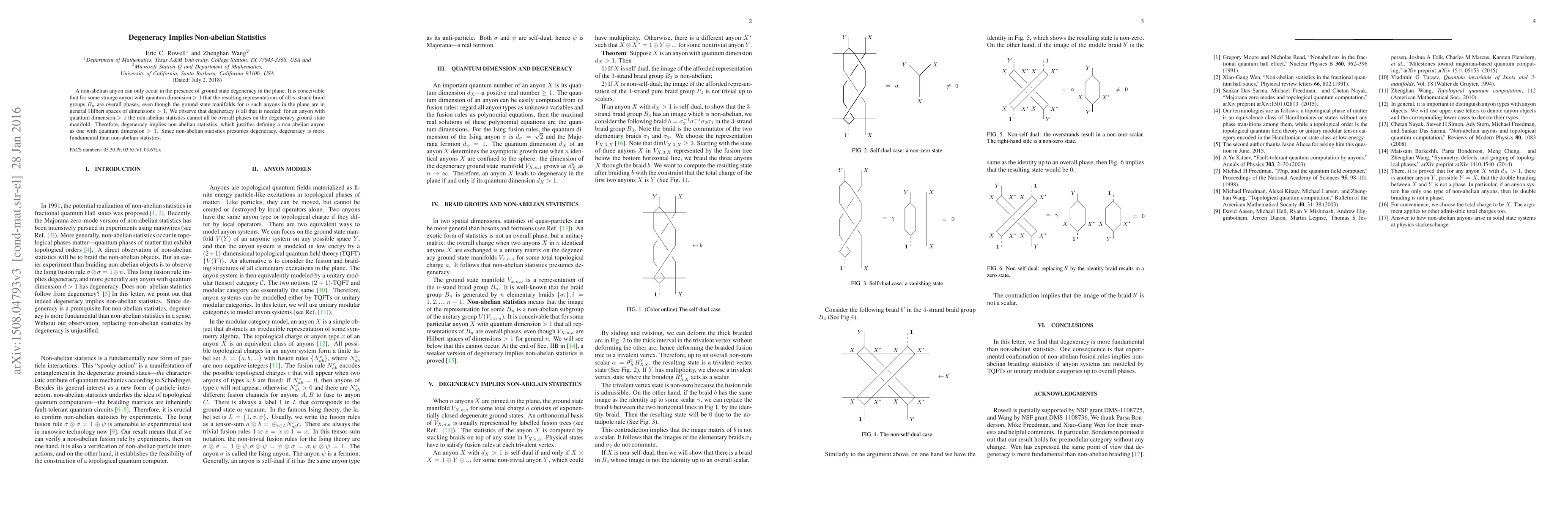 Summary: The paper establishes that ground state degeneracy is a prerequisite for non-abelian statistics in anyons, thereby implying that degeneracy underpins the emergence of non-abelian statistics, which is typically associated with anyons having quantum dimensions greater than one. This insight redefines non-abelian anyons based on the fundamental requirement of degeneracy.