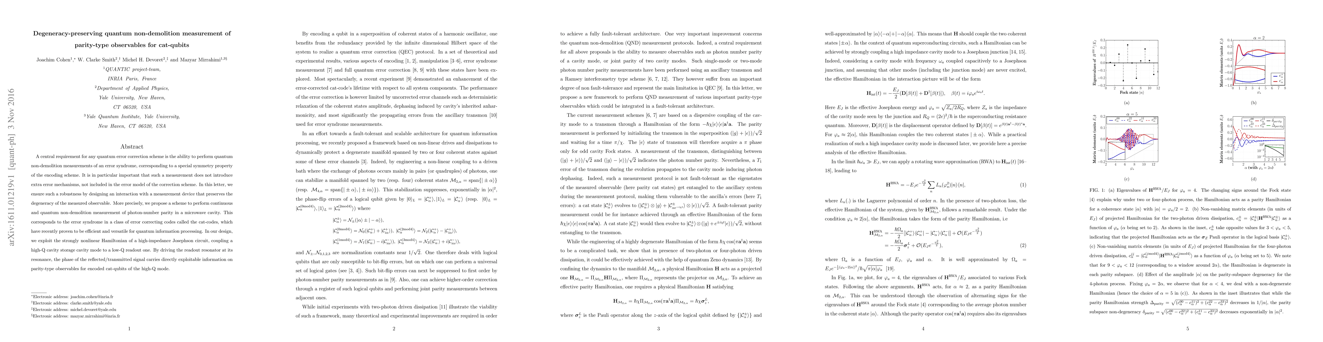This paper proposes a quantum non-demolition measurement scheme for photon-number parity in a microwave cavity to detect error syndromes in cat-codes, preserving the degeneracy of the measured observable without introducing new error mechanisms. The design leverages the nonlinear Hamiltonian of a Josephson circuit to achieve continuous measurement.