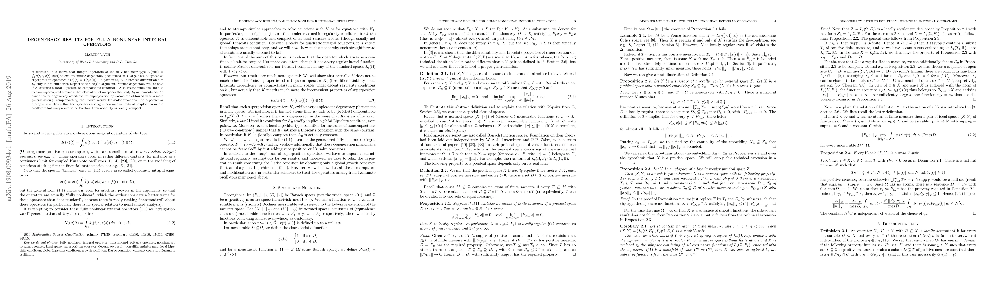 This paper demonstrates that fully nonlinear integral operators exhibit degeneracy similar to superposition operators, showing they are Fr\'echet differentiable in $L_p$ only if they are affine. The study extends these results to various function spaces, infinite measure spaces, and vector functions, and also provides new insights into the degeneracy of operators in coupled Kuramoto oscillators.