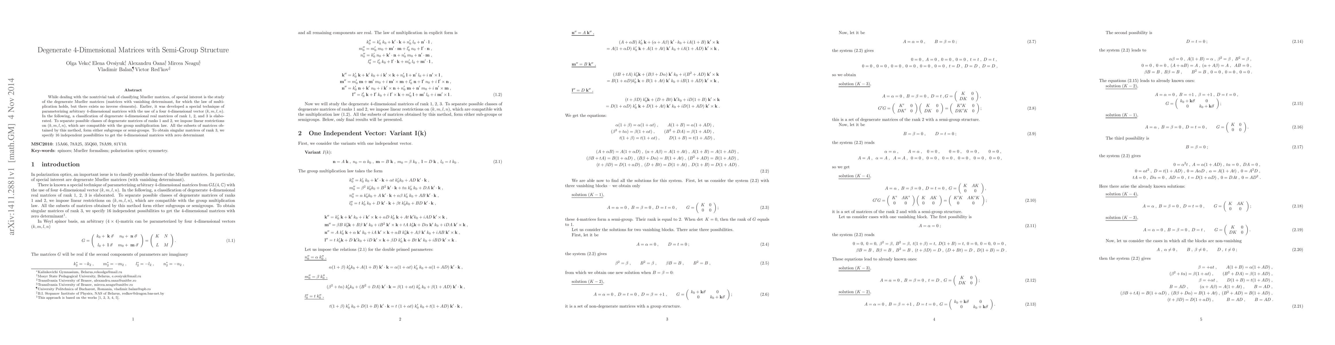 While dealing with the nontrivial task of classifying Mueller matrices, of special interest is the study of the degenerate Mueller matrices (matrices with vanishing determinant, for which the law of multiplication holds, but there exists no inverse elements). Earlier, it was developed a special technique of parameterizing arbitrary 4-dimensional matrices with the use of a four 4-dimensional vector (k,m,l,n). In the following, a classification of degenerate 4-dimensional real matrices of rank 1, 2, and 3 is elaborated. To separate possible classes of degenerate matrices of ranks 1 and 2, we impose linear restrictions on (k,m, l,n), which are compatible with the group multiplication law. All the subsets of matrices obtained by this method, form either subgroups or semi-groups. To obtain singular matrices of rank 3, we specify 16 independent possibilities to get the 4-dimensional matrices with zero determinant