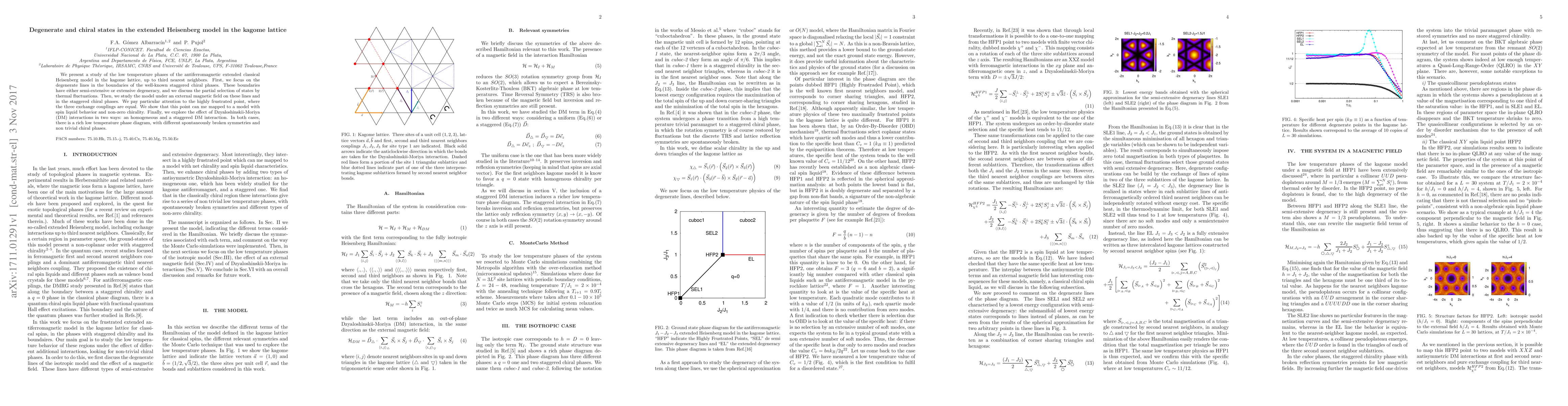 This paper investigates the low-temperature phases of the extended Heisenberg model on the kagome lattice, focusing on degenerate and chiral states. It explores the boundaries of staggered chiral phases and their degeneracy, and examines the effects of magnetic fields and Dzyaloshinskii-Moriya interactions, revealing a complex phase diagram with various broken symmetries and chiral phases.