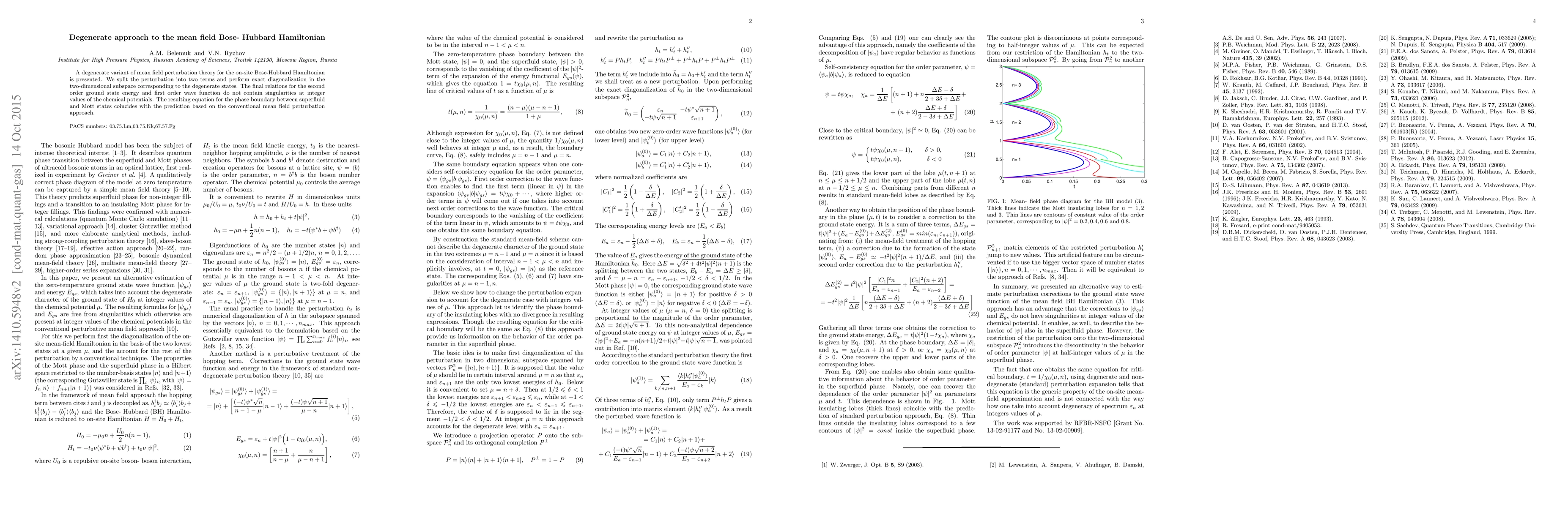 The research presents a degenerate variant of mean field perturbation theory for the on-site Bose-Hubbard Hamiltonian, splitting the perturbation into two terms and performing exact diagonalization in a two-dimensional subspace corresponding to degenerate states.