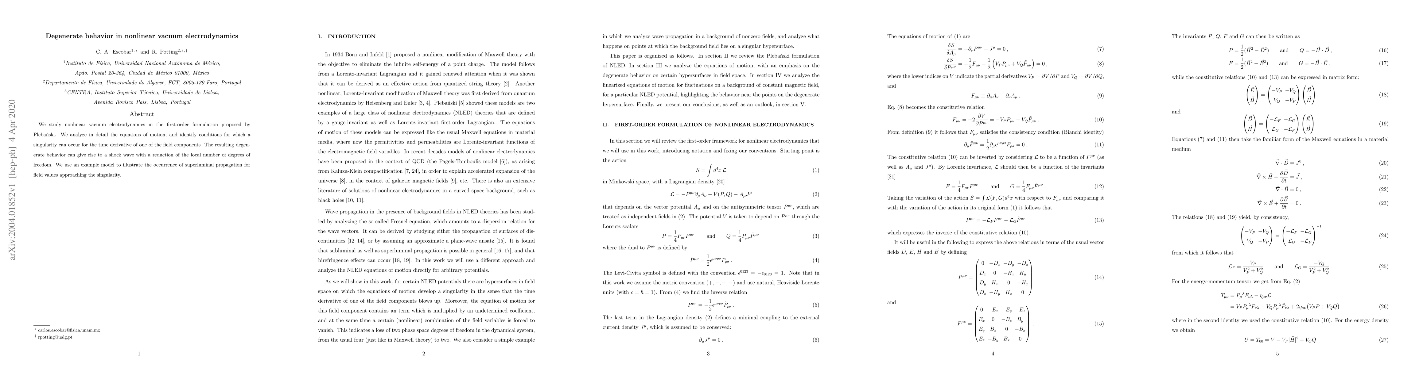We study nonlinear vacuum electrodynamics in the first-order formulation proposed by Pleba\'nski. We analyze in detail the equations of motion, and identify conditions for which a singularity can occur for the time derivative of one of the field components. The resulting degenerate behavior can give rise to a shock wave with a reduction of the local number of degrees of freedom. We use an example model to illustrate the occurrence of superluminal propagation for field values approaching the singularity.