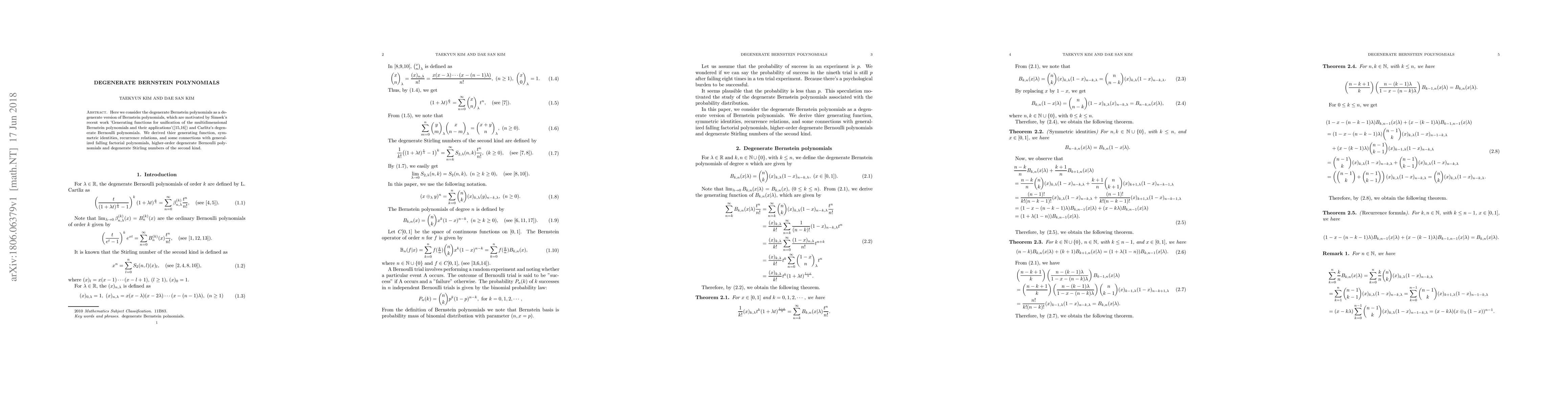 This paper introduces degenerate Bernstein polynomials, a generalization of traditional Bernstein polynomials, and explores their generating functions, symmetric identities, and recurrence relations. It also examines connections with generalized falling factorial polynomials, higher-order degenerate Bernoulli polynomials, and degenerate Stirling numbers of the second kind.