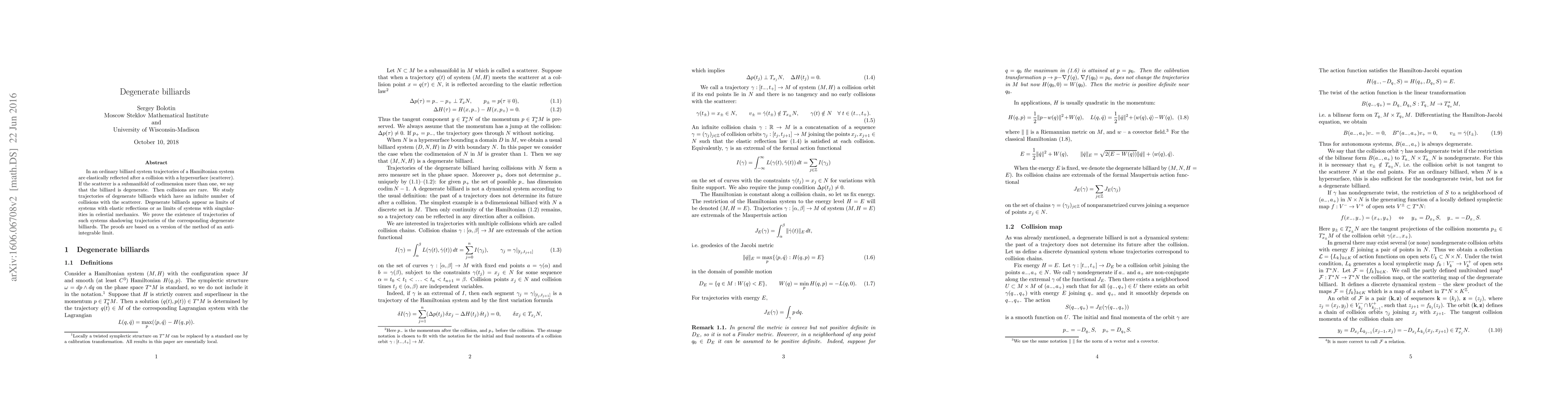 In an ordinary billiard system trajectories of a Hamiltonian system are elastically reflected after a collision with a hypersurface (scatterer). If the scatterer is a submanifold of codimension more than one, we say that the billiard is degenerate. Then collisions are rare. We study trajectories of degenerate billiards which have an infinite number of collisions with the scatterer. Degenerate billiards appear as limits of systems with elastic reflections or as limits of systems with singularities in celestial mechanics. We prove the existence of trajectories of such systems shadowing trajectories of the corresponding degenerate billiards. The proofs are based on a version of the method of an anti-integrable limit.