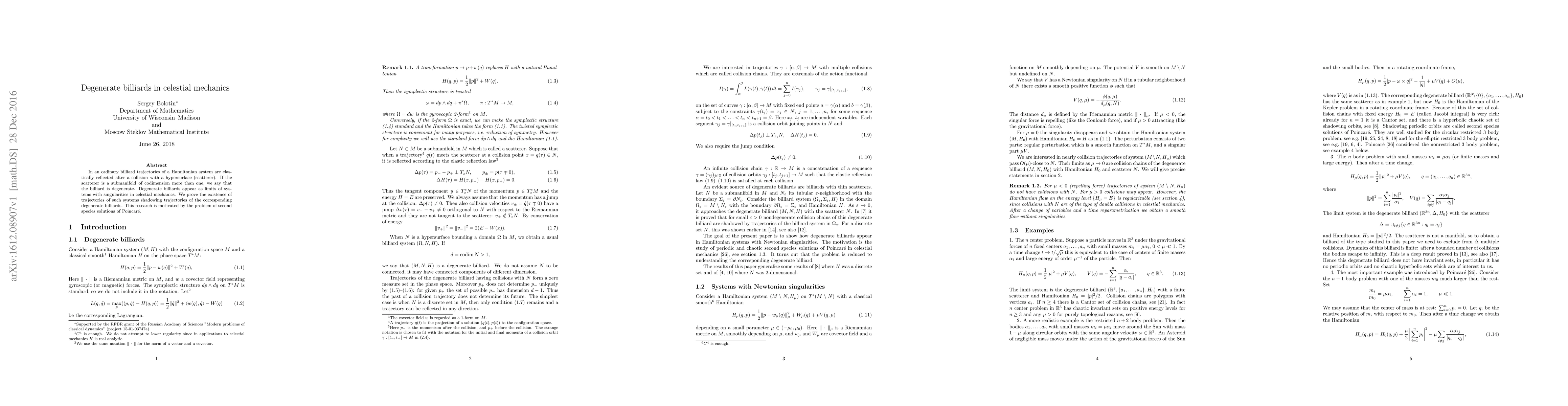 Summary: This paper explores degenerate billiards in celestial mechanics, proving the existence of trajectories that shadow the behavior of billiards confined to submanifolds of higher codimension, motivated by the study of second species solutions of Poincaré.
