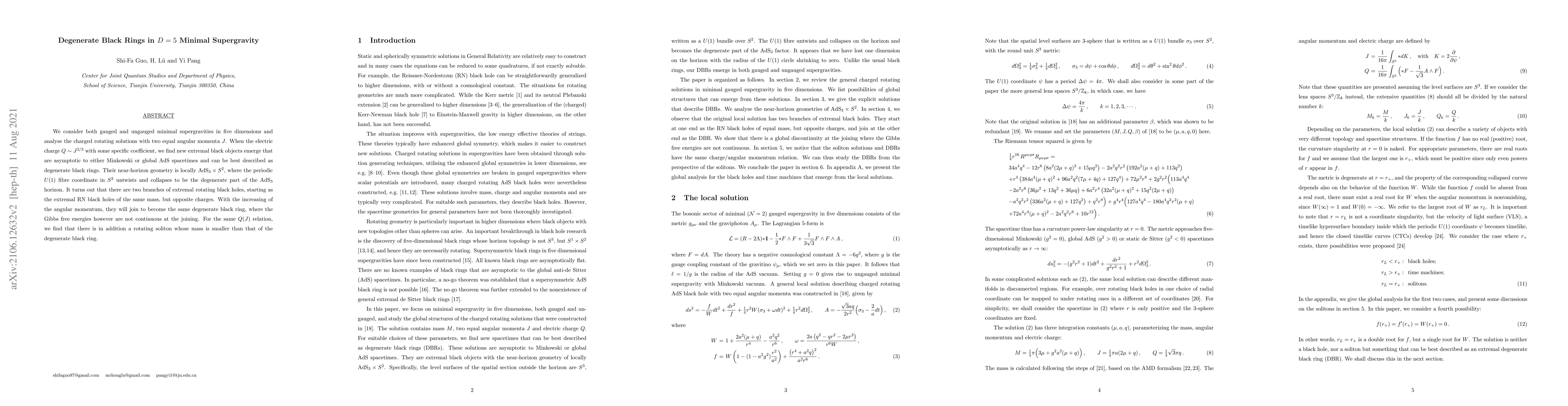We consider both gauged and ungauged minimal supergravities in five dimensions and analyse the charged rotating solutions with two equal angular momenta $J$. When the electric charge $Q\sim J^{2/3}$ with some specific coefficient, we find new extremal black objects emerge that are asymptotic to either Minkowski or global AdS spacetimes and can be best described as degenerate black rings. Their near-horizon geometry is locally AdS$_3\times S^2$, where the periodic $U(1)$ fibre coordinate in $S^3$ untwists and collapses to be the degenerate part of the AdS$_3$ horizon. It turns out that there are two branches of extremal rotating black holes, starting as the extremal RN black holes of the same mass, but opposite charges. With the increasing of the angular momentum, they will join to become the same degenerate black ring, where the Gibbs free energies however are not continuous at the joining. For the same $Q(J)$ relation, we find that there is in addition a rotating soliton whose mass is smaller than the degenerate black ring.
