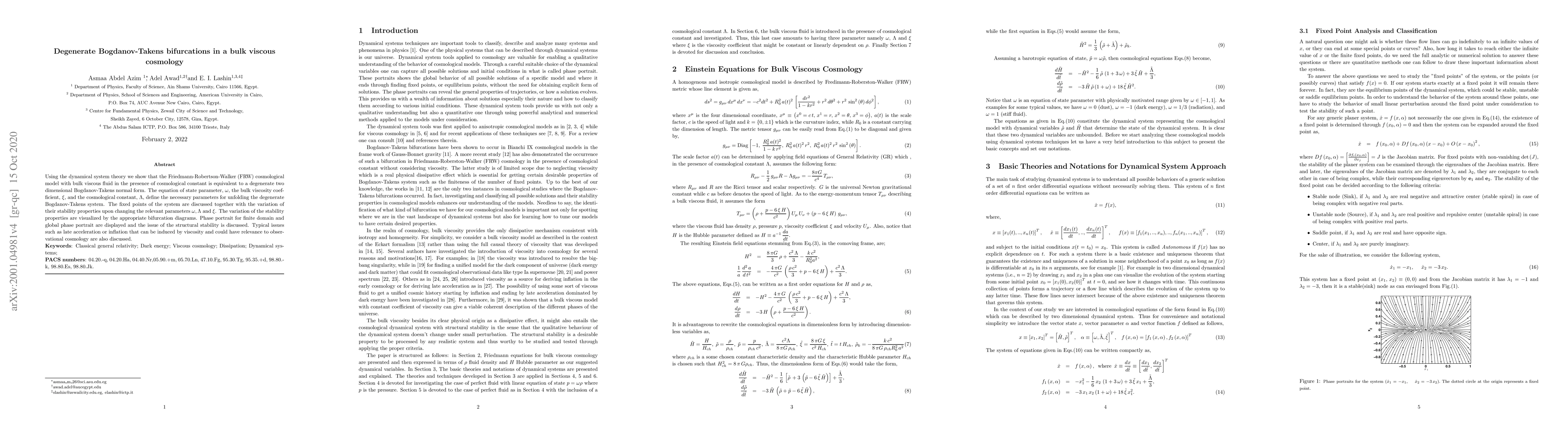 This paper explores the dynamics of a Friedmann-Robertson-Walker model with bulk viscous fluid and a cosmological constant, revealing it as a degenerate Bogdanov-Takens bifurcation. The study examines the stability variations and bifurcations influenced by parameters like the equation of state, bulk viscosity, and cosmological constant, with implications for late acceleration and inflation in cosmology.
