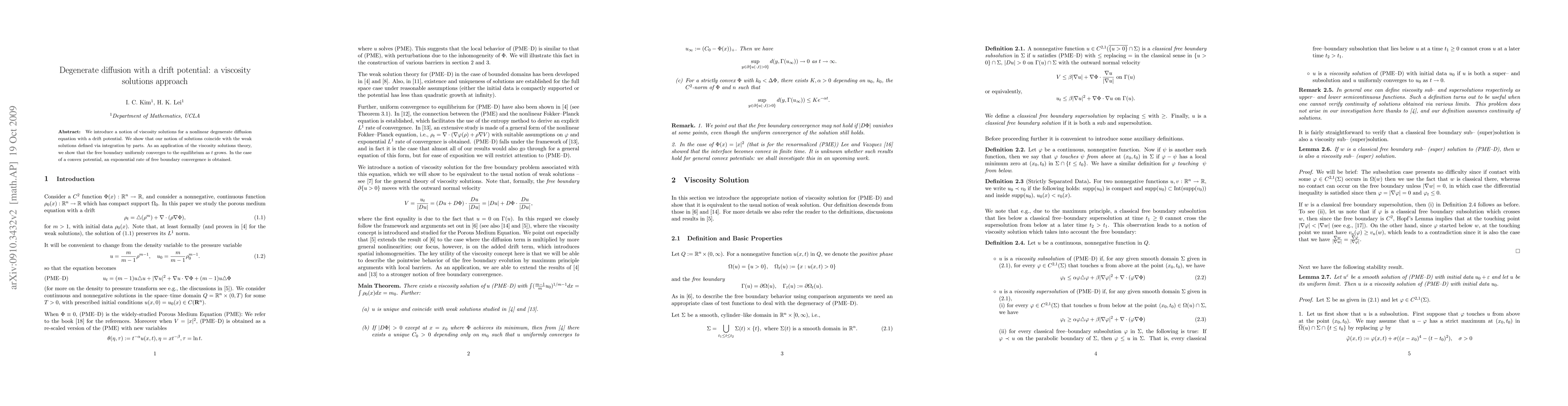 We introduce a notion of viscosity solutions for a nonlinear degenerate diffusion equation with a drift potential. We show that our notion of solutions coincide with the weak solutions defined via integration by parts. As an application of the viscosity solutions theory, we show that the free boundary uniformly converges to the equilibrium as time grows. In the case of a convex potential, an exponential rate of free boundary convergence is obtained.