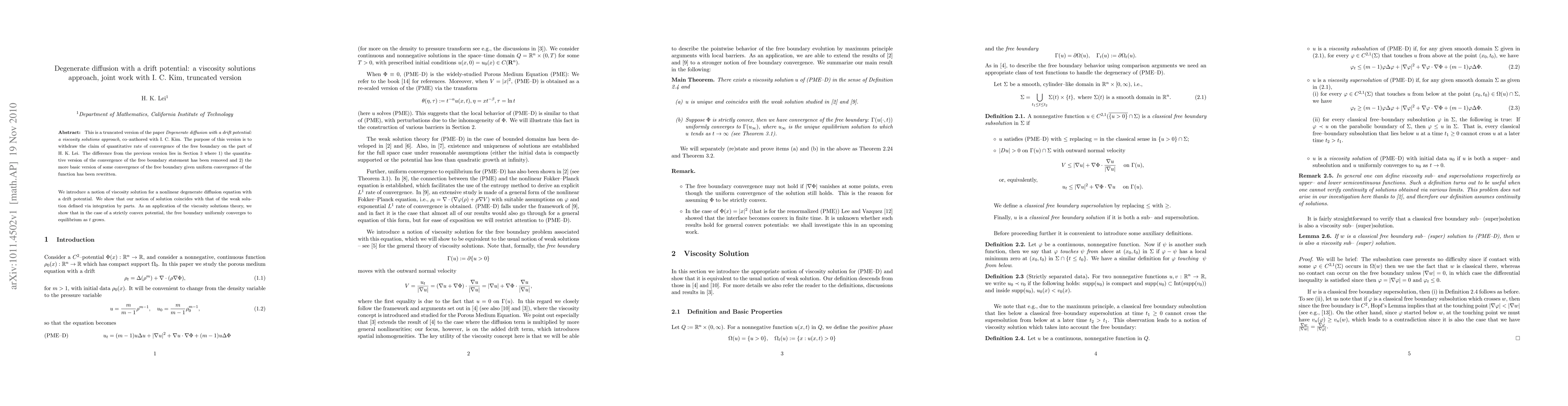 This is a truncated version of the paper "Degenerate diffusion with a drift potential: a viscosity solutions approach", co-authored with I. C. Kim. The purpose of this version is to withdraw the claim of quantitative rate of convergence of the free boundary on the part of H. K. Lei. The difference from the previous version lies in Section 3 where 1) the quantitative version of the convergence of the free boundary statement has been removed and 2) the more basic version of some convergence of the free boundary given uniform convergence of the function has been rewritten. It is emphasized that while some effort has been made towards better exposition and clarity with regard to showing some convergence of the free boundary given uniform convergence of the function (see Section 3) there is no new result here. Quite on the contrary, as the title indicates, what is contained here is a strict subset of the original. We introduce a notion of viscosity solution for a nonlinear degenerate diffusion equation with a drift potential. We show that our notion of solution coincides with that of the weak solu- tion defined via integration by parts. As an application of the viscosity solutions theory, we show that in the case of a strictly convex potential, the free boundary uniformly converges to equilibrium as $t$ grows.