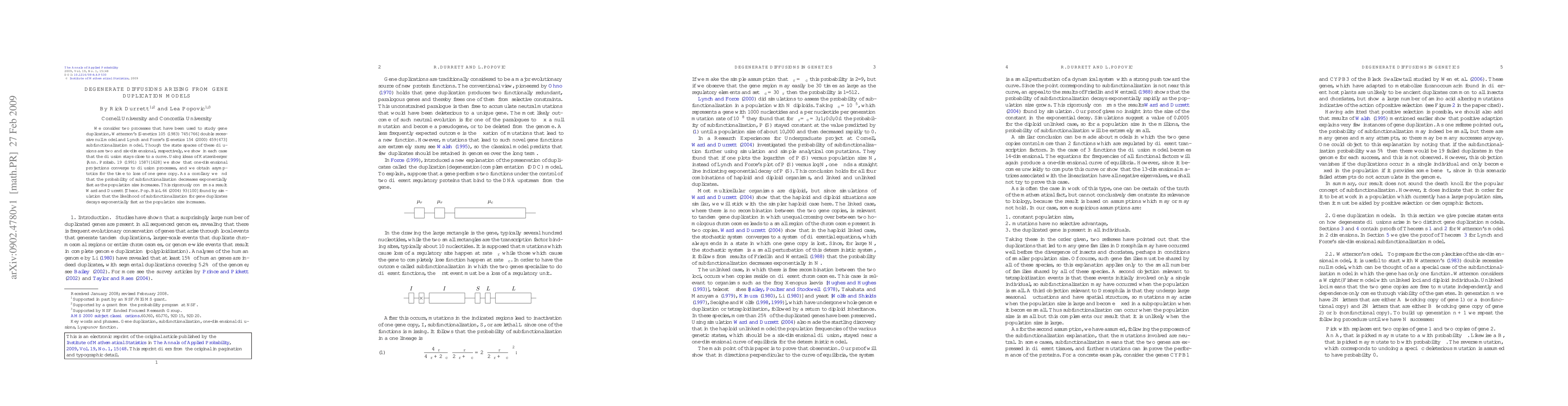 We consider two processes that have been used to study gene duplication, Watterson's [Genetics 105 (1983) 745--766] double recessive null model and Lynch and Force's [Genetics 154 (2000) 459--473] subfunctionalization model. Though the state spaces of these diffusions are two and six-dimensional, respectively, we show in each case that the diffusion stays close to a curve. Using ideas of Katzenberger [Ann. Probab. 19 (1991) 1587--1628] we show that one-dimensional projections converge to diffusion processes, and we obtain asymptotics for the time to loss of one gene copy. As a corollary we find that the probability of subfunctionalization decreases exponentially fast as the population size increases. This rigorously confirms a result Ward and Durrett [Theor. Pop. Biol. 66 (2004) 93--100] found by simulation that the likelihood of subfunctionalization for gene duplicates decays exponentially fast as the population size increases.
