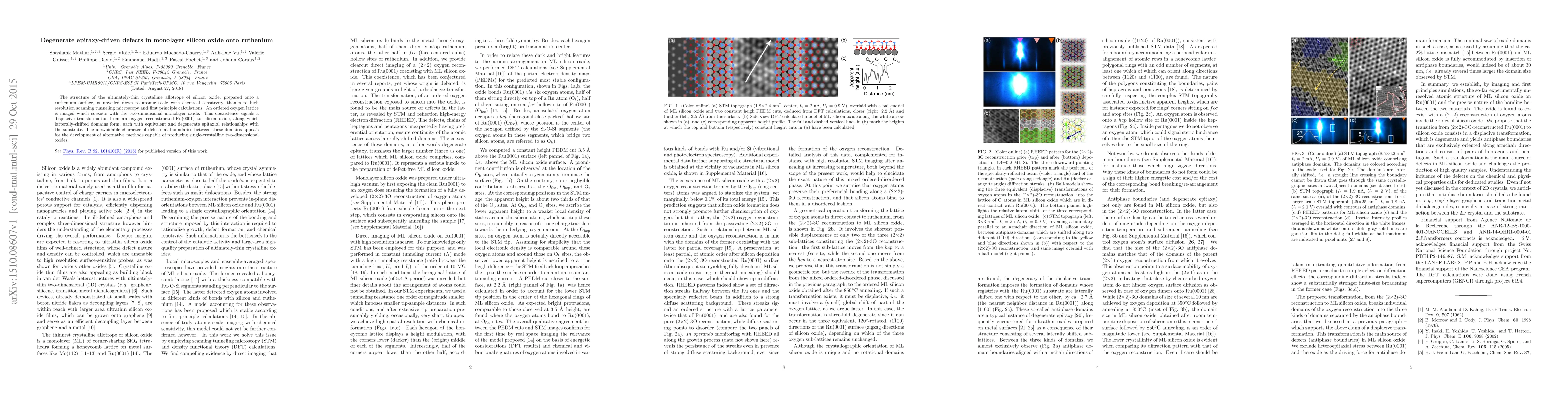 The structure of the ultimately-thin crystalline allotrope of silicon oxide, prepared onto a ruthenium surface, is unveiled down to atomic scale with chemical sensitivity, thanks to high resolution scanning tunneling microscopy and first principle calculations. An ordered oxygen lattice is imaged which coexists with the two-dimensional monolayer oxide. This coexistence signals a displacive transformation from an oxygen reconstructed-Ru(0001) to silicon oxide, along which latterally-shifted domains form, each with equivalent and degenerate epitaxial relationships with the substrate. The unavoidable character of defects at boundaries between these domains appeals for the development of alternative methods capable of producing single-crystalline two-dimensional oxides.
