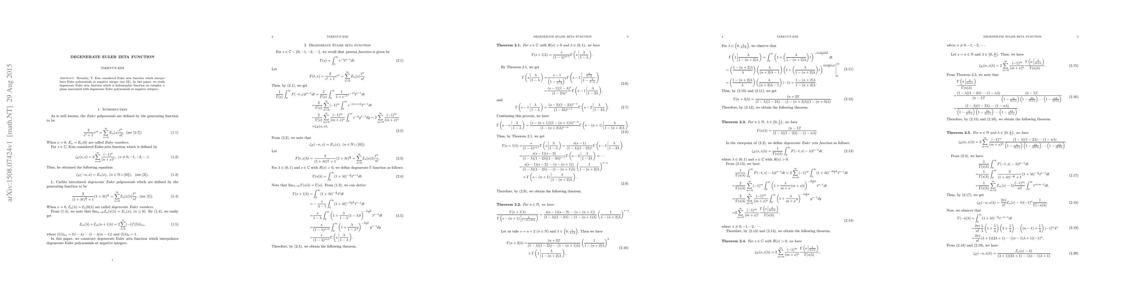Summary: This paper investigates the degenerate Euler zeta function, a holomorphic function linked to degenerate Euler polynomials evaluated at negative integers, expanding on T. Kim's earlier work on the Euler zeta function.