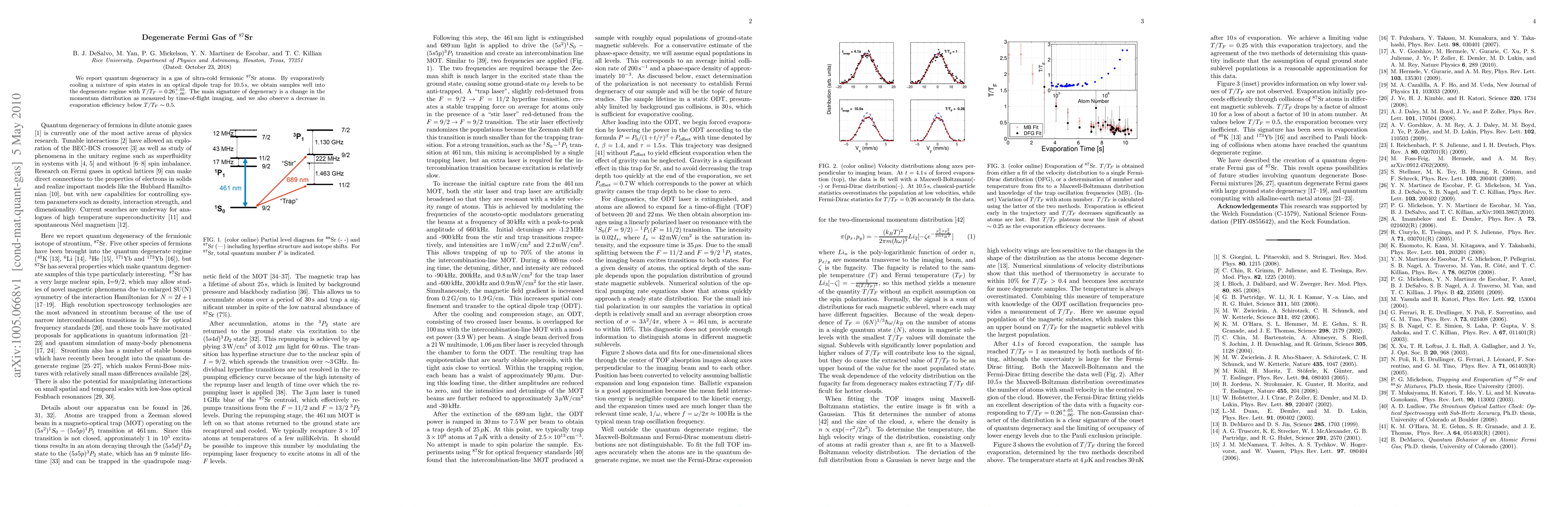 Researchers have successfully created a quantum degenerate gas of 87Sr atoms, achieving temperatures comparable to the Fermi temperature, with evaporation efficiency decreasing below T/F ~ 0.5.