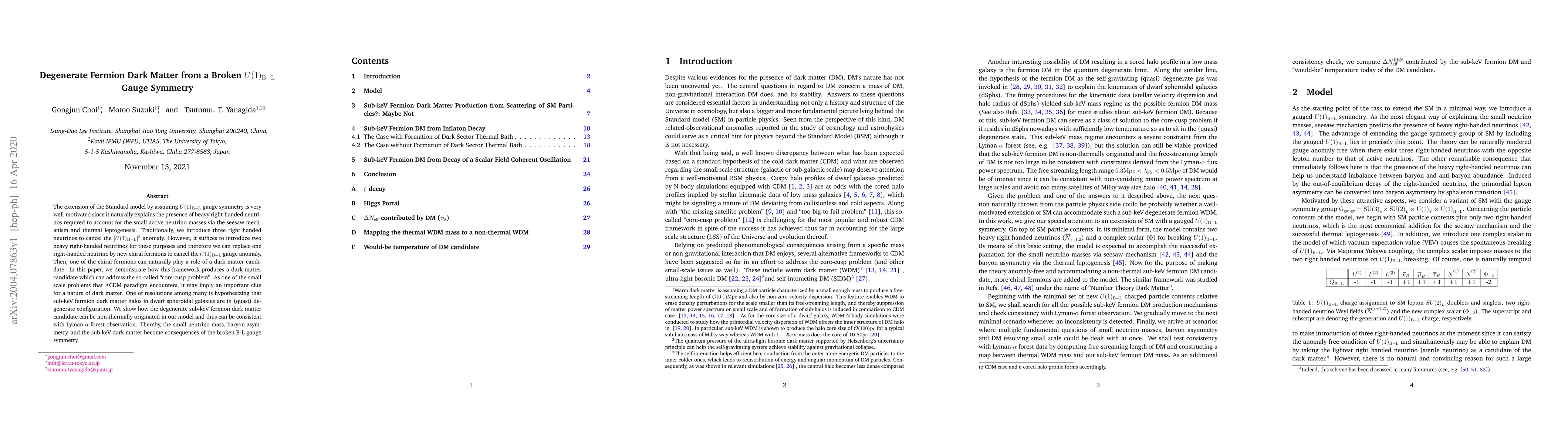 This paper explores a model extending the Standard Model with broken $U(1)_{\rm B-L}$ gauge symmetry, introducing two heavy right-handed neutrinos and a new chiral fermion to cancel gauge anomalies. The chiral fermion serves as a degenerate sub-keV fermion dark matter candidate that resolves the core-cusp problem and aligns with Lyman-$\alpha$ forest observations.