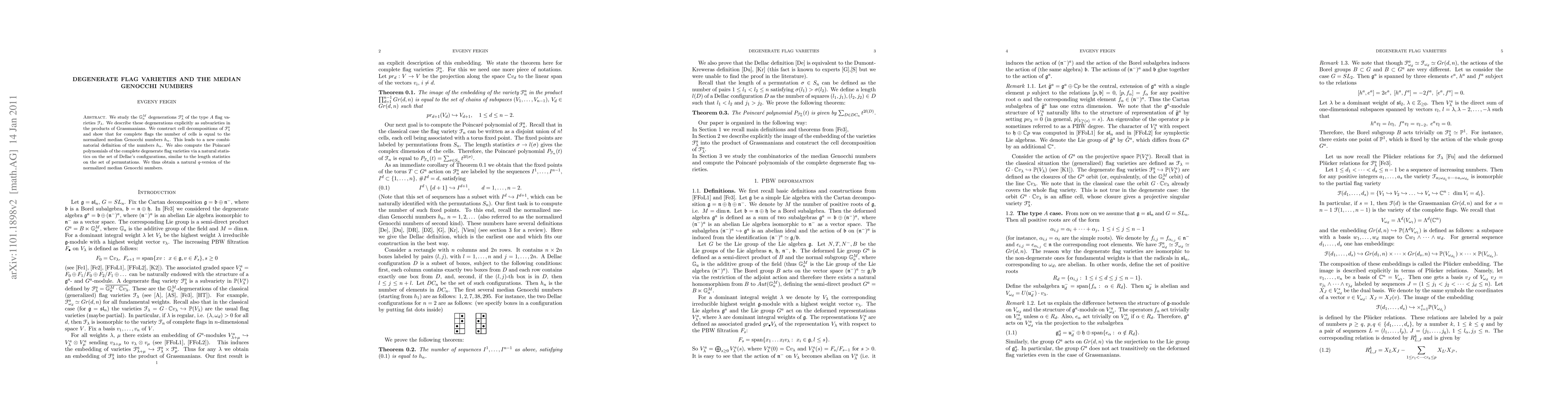 This paper investigates the degenerations of type $A$ flag varieties, describing them as subvarieties in products of Grassmannians and establishing a cell decomposition. It finds that the number of cells in complete flags corresponds to normalized median Genocchi numbers $h_n$, providing a new combinatorial definition for these numbers.