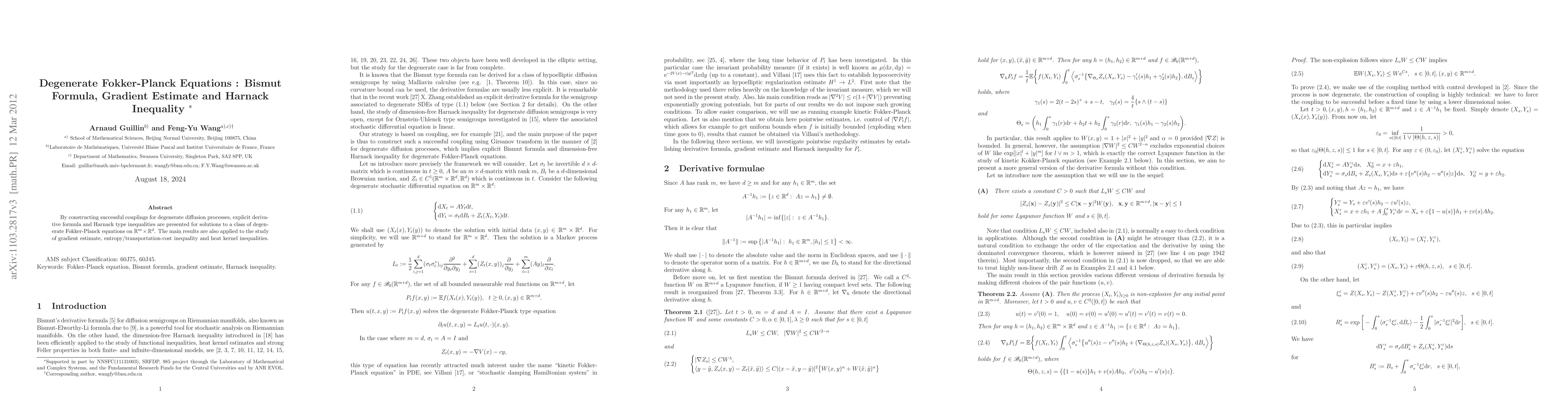 This paper develops couplings for degenerate diffusion processes to derive explicit derivative formulas and Harnack inequalities for degenerate Fokker-Planck equations in $\R^m\times\R^{d}$. The results are applied to gradient estimates, entropy inequalities, and heat kernel inequalities.