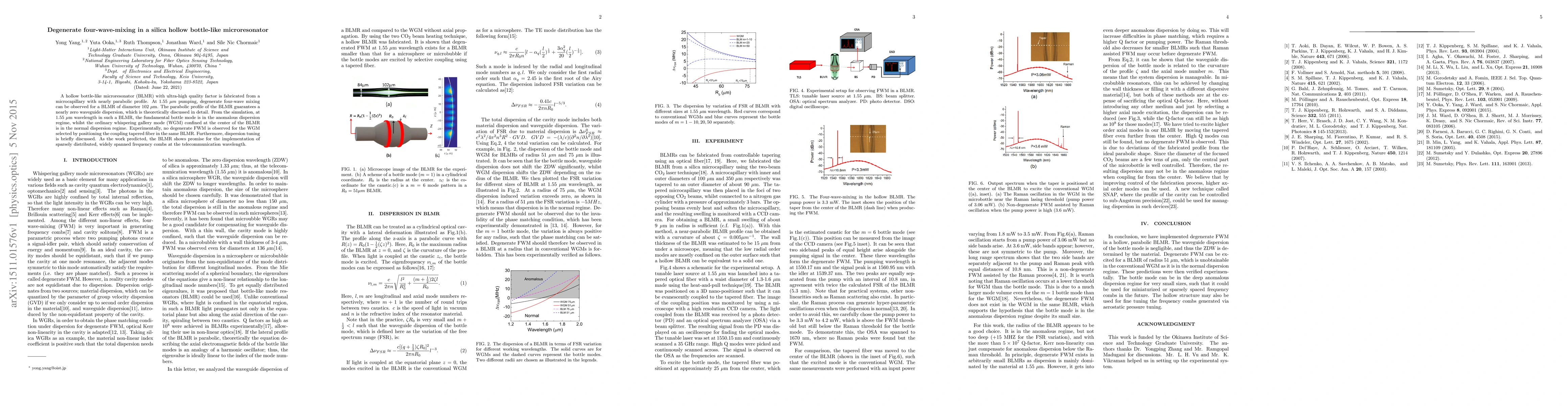 This research demonstrates degenerate four-wave mixing in a silica hollow bottle-like microresonator (BLMR) with ultra-high quality factor due to its nearly parabolic profile. Despite theoretical predictions of anomalous dispersion for the fundamental mode, experimental results show no degenerate FWM, indicating potential for future development in frequency combs at telecommunication wavelengths.