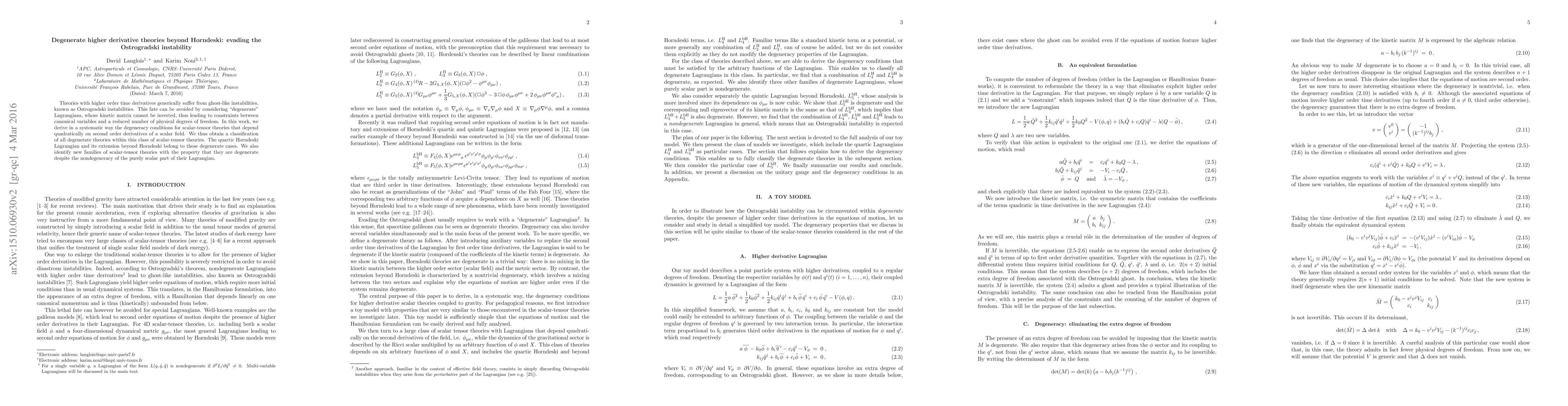 This paper systematically derives degeneracy conditions for scalar-tensor theories with second-order derivative terms, classifying all degenerate cases beyond the quartic Horndeski Lagrangian. It identifies new families of theories that evade the Ostrogradski instability despite having nondegenerate scalar components.