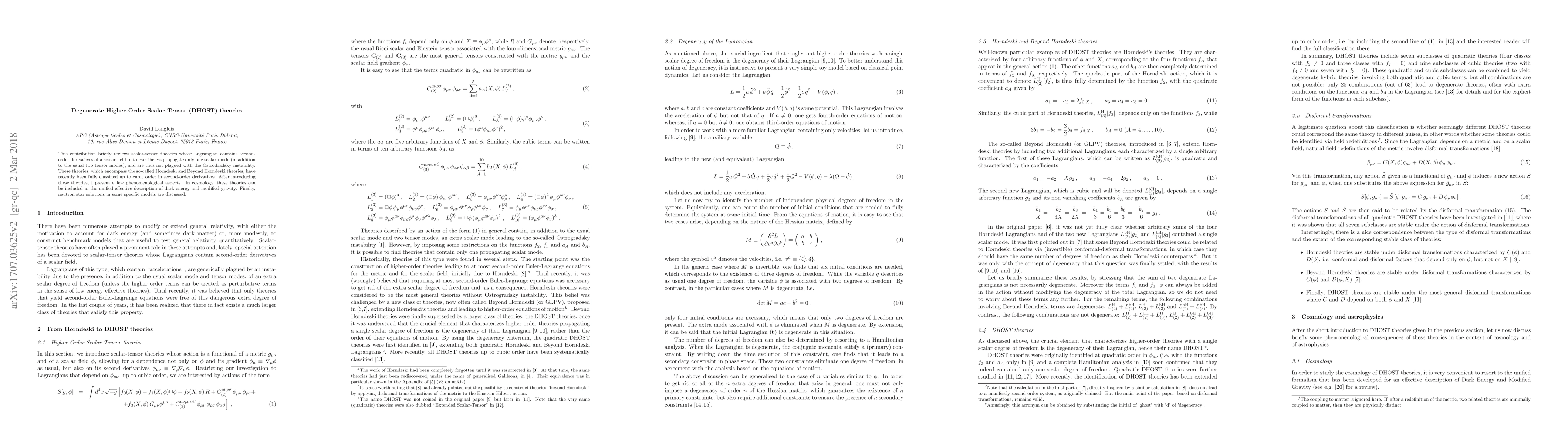 This paper reviews degenerate higher-order scalar-tensor (DHOST) theories, which propagate only one scalar mode despite containing second-order derivatives, avoiding the Ostrogradsky instability. It discusses their classification, cosmological implications, and neutron star solutions in specific models.