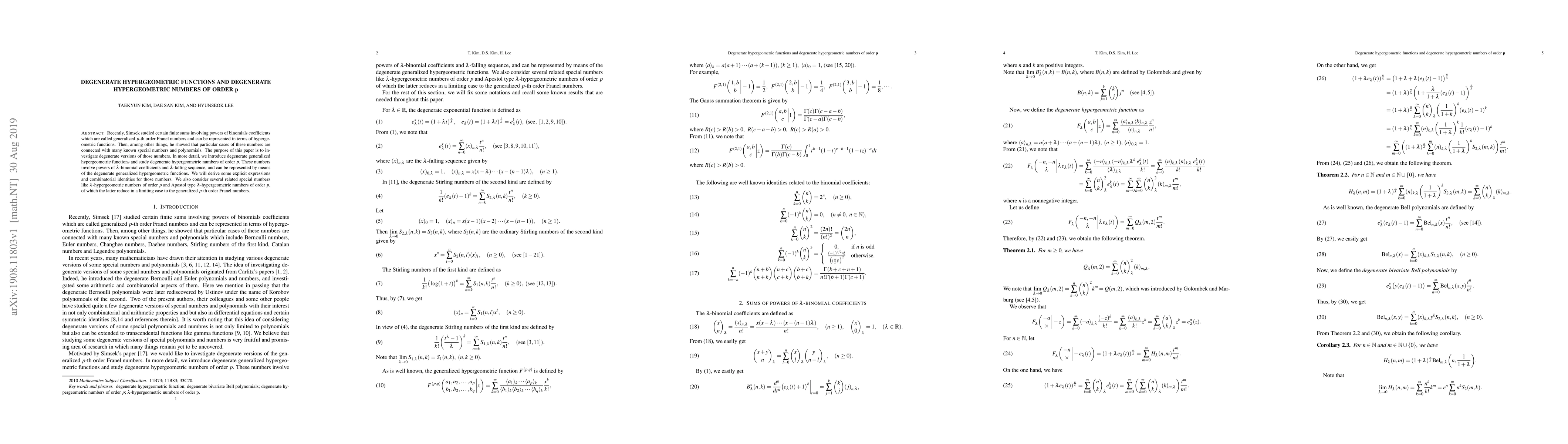 This paper introduces degenerate generalized hypergeometric functions and explores degenerate hypergeometric numbers of order p, represented via lambda-binomial coefficients and lambda-falling sequences. It derives explicit expressions and combinatorial identities for these numbers and examines related special numbers, including lambda-hypergeometric numbers and Apostol type lambda-hypergeometric numbers, which converge to generalized p-th order Franel numbers.