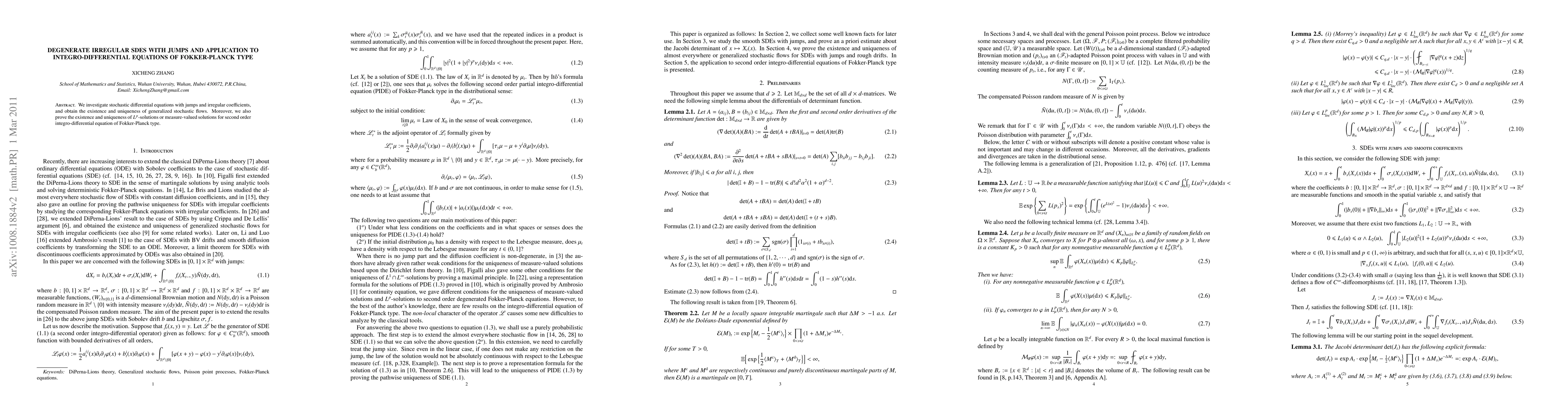 This paper explores stochastic differential equations (SDEs) with jumps and irregular coefficients, establishing the existence and uniqueness of generalized stochastic flows. It also proves the existence and uniqueness of $L^p$-solutions or measure-valued solutions for second-order integro-differential equations of Fokker-Planck type.