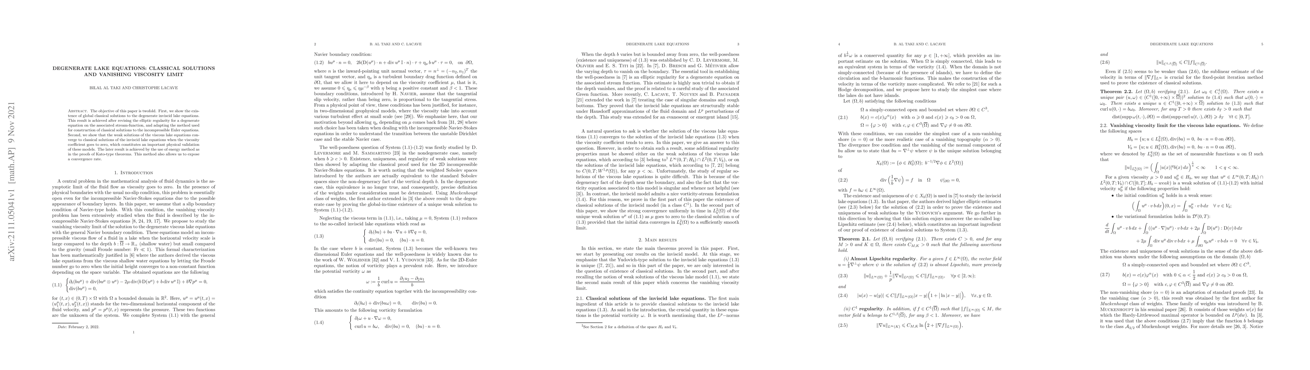 The objective of this paper is twofold. First, we show the existence of global classical solutions to the degenerate inviscid lake equations. This result is achieved after revising the elliptic regularity for a degenerate equation on the associated stream-function, and adapting the method used for construction of classical solutions to the incompressible Euler equations. Second, we show that the weak solutions of the viscous lake equations converge to classical solutions of the inviscid lake equations when the viscosity coefficient goes to zero, which constitutes an important physical validation of these models. The later result is achieved by the use of energy method as in the proofs of Kato-type theorems. This method also allows us to expose a convergence rate.