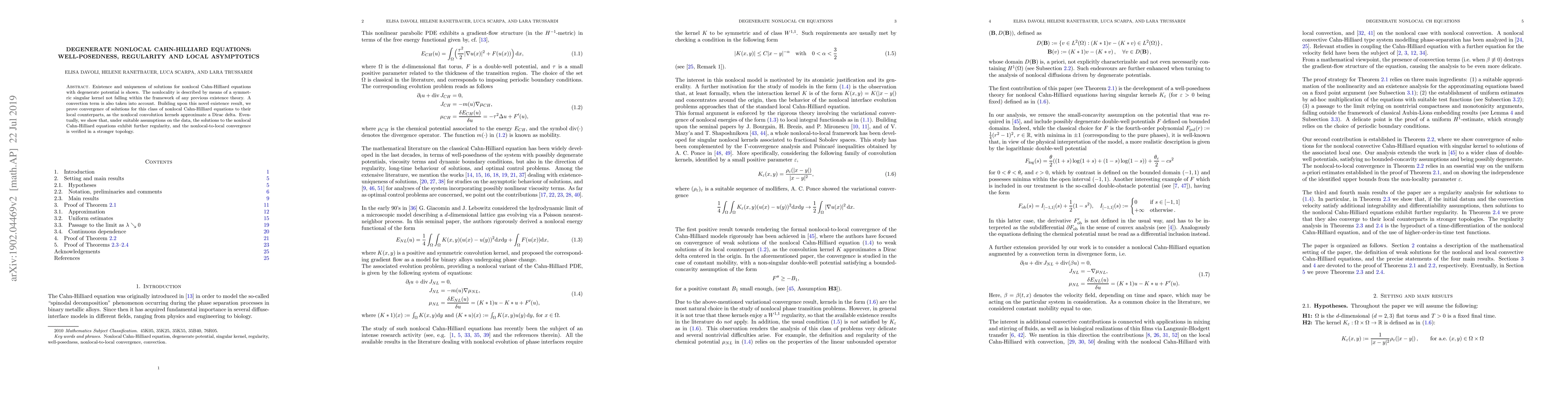 This paper establishes the existence, uniqueness, and regularity of solutions for degenerate nonlocal Cahn-Hilliard equations with a novel nonlocality kernel. It also demonstrates the convergence of these solutions to local Cahn-Hilliard equations as the kernel approximates a Dirac delta, confirming stronger convergence under suitable data conditions.