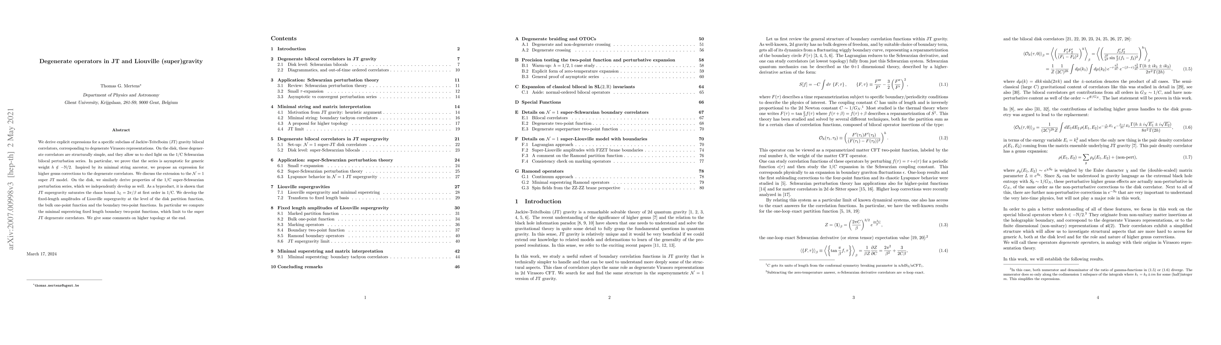 We derive explicit expressions for a specific subclass of Jackiw-Teitelboim (JT) gravity bilocal correlators, corresponding to degenerate Virasoro representations. On the disk, these degenerate correlators are structurally simple, and they allow us to shed light on the 1/C Schwarzian bilocal perturbation series. In particular, we prove that the series is asymptotic for generic weight $h\notin - \mathbb{N}/2$. Inspired by its minimal string ancestor, we propose an expression for higher genus corrections to the degenerate correlators. We discuss the extension to the $\mathcal{N}=1$ super JT model. On the disk, we similarly derive properties of the 1/C super-Schwarzian perturbation series, which we independently develop as well. As a byproduct, it is shown that JT supergravity saturates the chaos bound $\lambda_L = 2\pi/\beta$ at first order in 1/C. We develop the fixed-length amplitudes of Liouville supergravity at the level of the disk partition function, the bulk one-point function and the boundary two-point functions. In particular we compute the minimal superstring fixed length boundary two-point functions, which limit to the super JT degenerate correlators. We give some comments on higher topology at the end.