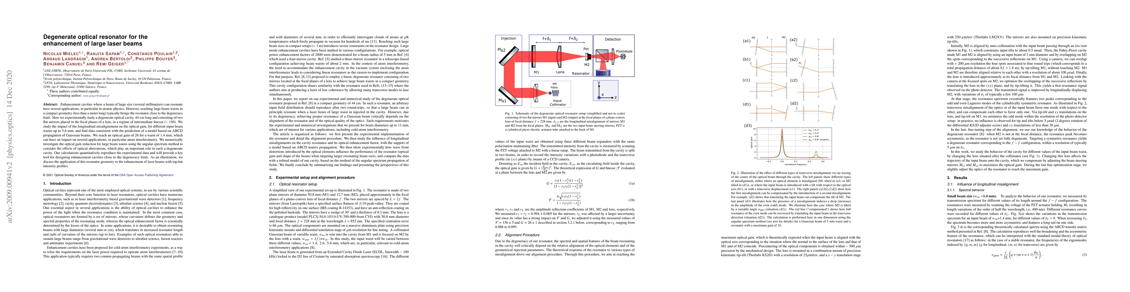 Researchers created a degenerate optical resonator to enhance large laser beams, achieving an optical gain of 26 for beam waists up to 1.4mm in a compact geometry.